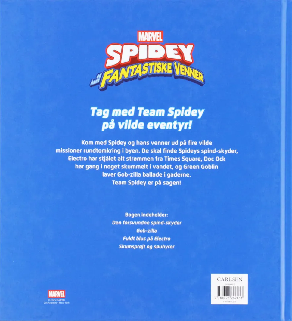 Spændende bog fra Forlaget Carlsen med titlen Spidey og hans fantastiske venner – Den forsvundne spind-skyder.