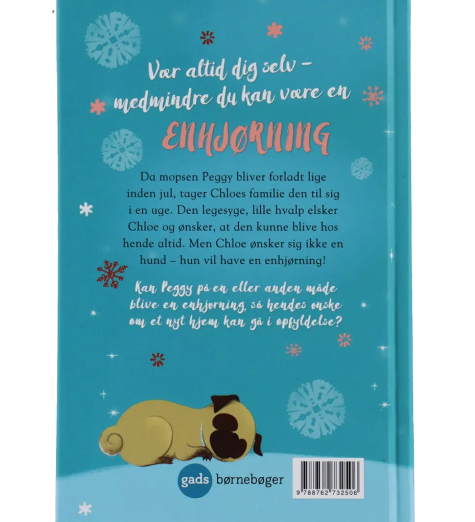 Gads Forlag bogen handler om hunden Peggy, som bliver forladt af sin familie lige inden jul. Heldigvis tager Chloe og hendes familie sig af den lille mops, men Chloe vil faktisk hellere have en enhjørning. Så kan Peggy forvandles til en enhjørning og blive boende hos den lille familie?
