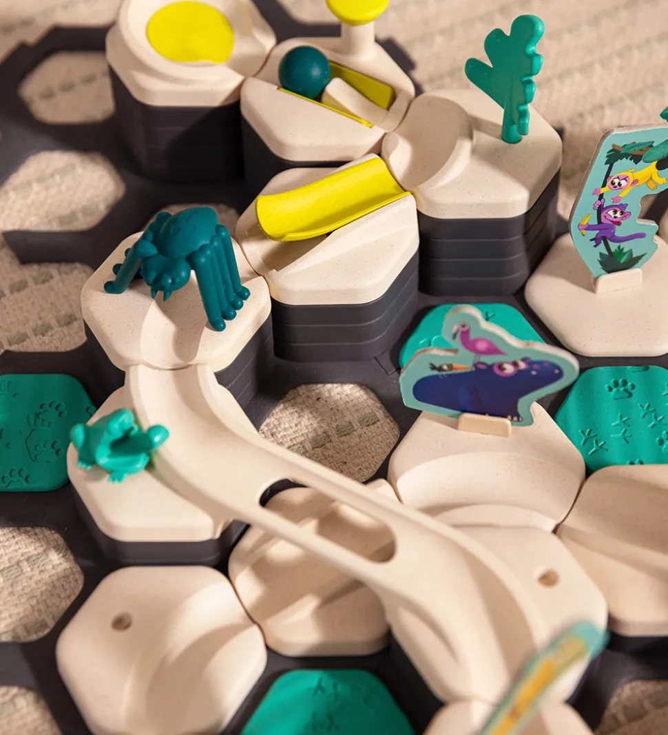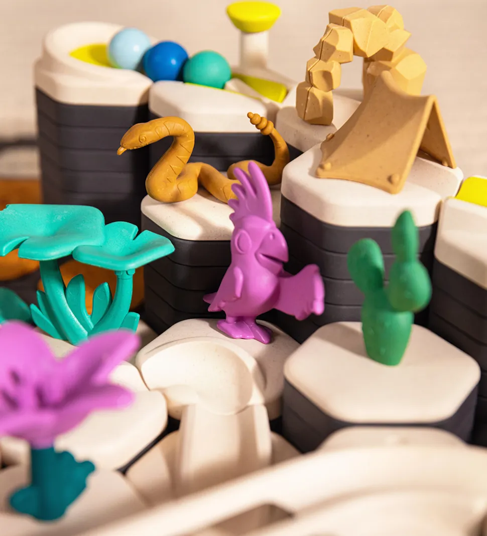Gravitrax Junior kuglebanen kan bygges lige som man har lyst til, og man kan bygge sjove kuglebaner med forskellige elementer, som får kuglen til til at trille, stoppe eller ændre kurs. Dette begyndersæt har specialdesignede elementer til yngre børn.