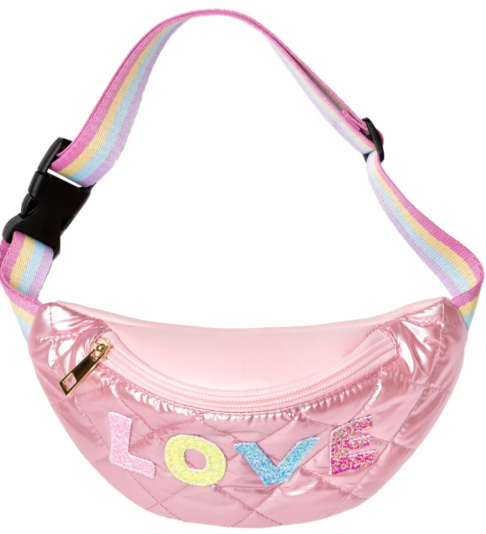 Flot Great Pretenders bæltetaske i skinnende rosa, imiteret skind og med en quiltet struktur og “LOVE” i glimmerbogstaver fortil.