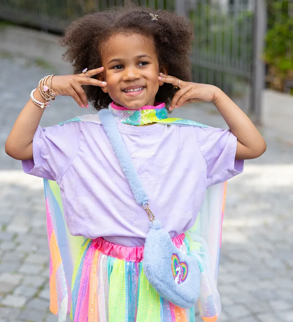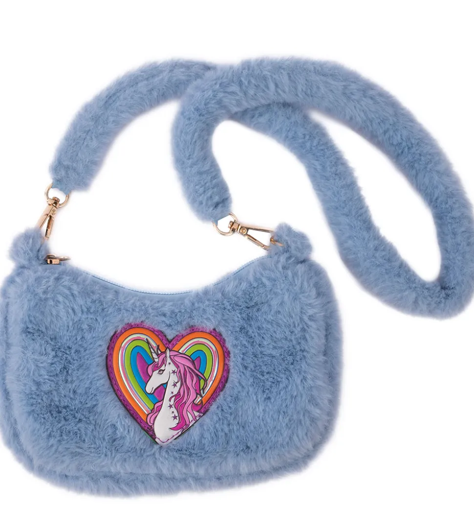 Sød Great Pretenders skuldertaske med et sødt enhjørning- og regnbueprint på fronten. Tasken er i en flot blå nuance og har en blød overflade af imiteret pels, samt en praktisk skulderrem.