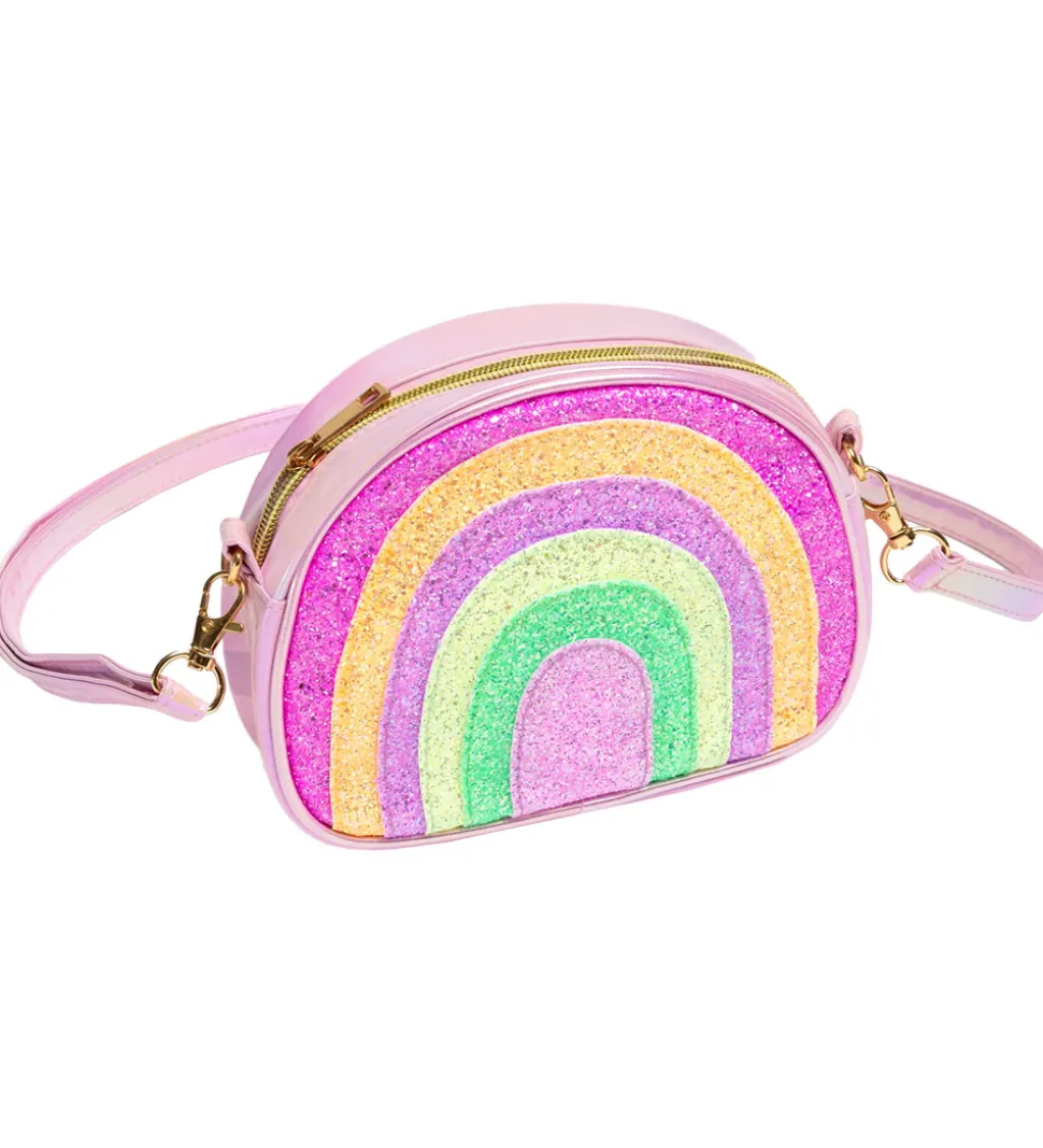 Flot Great Pretenders skuldertaske i skinnende rosa, imiteret skind og med en side, der er lavet som en farverig glimmerregnbue.