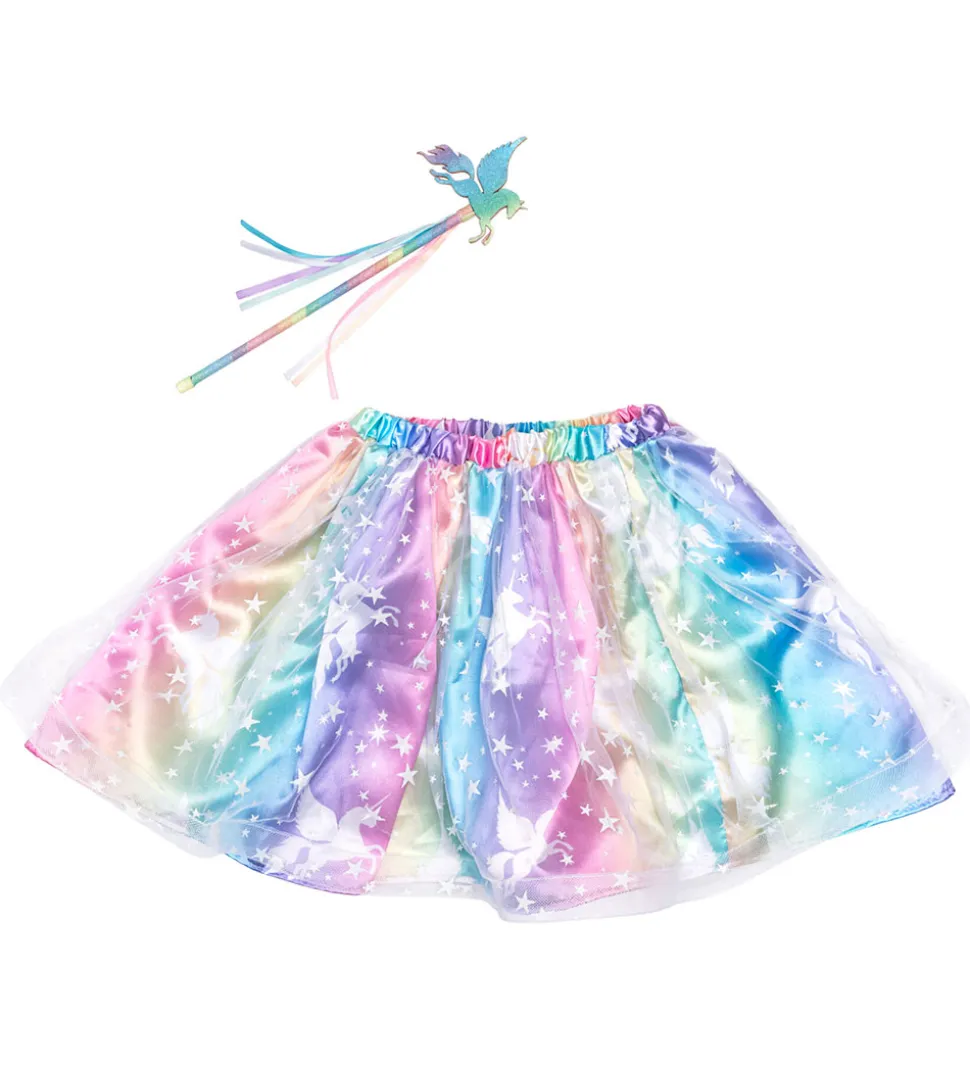 Flot Great Pretenders udklædning i form af en tylnederdel med hvidt tyl med hvide stjerner og et stribet inderlag i rosa, lilla, grøn, blå og gul med hvidt enhjørningeprint samt en enhjørninge-tryllestav.