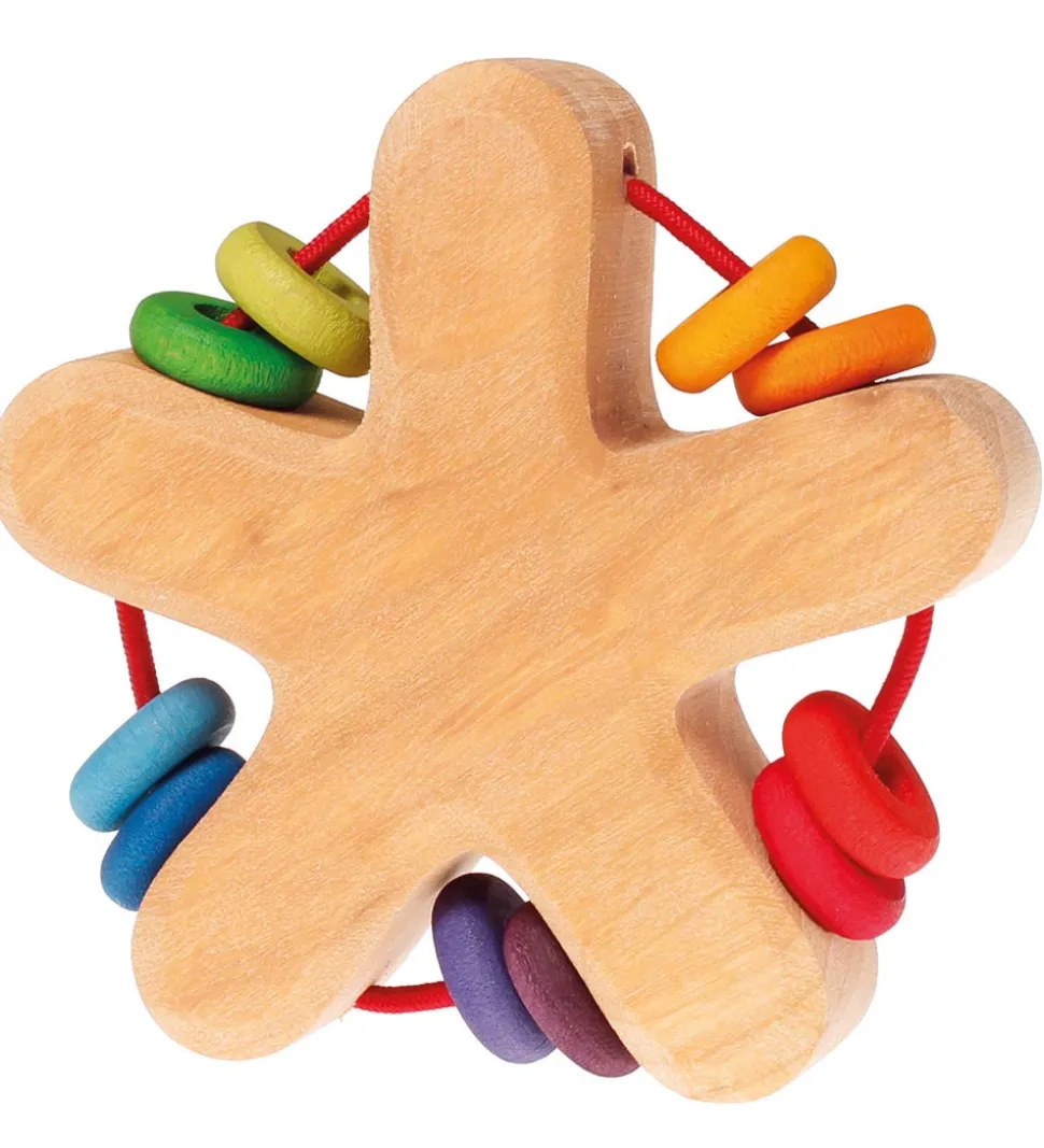 Grimms ranglen er lavet i træ og er perfekt til de små, som stadig er ved at øve motorikken og sanserne. Ranglen har en god form, så den er let for selv de små at holde fast i og når man ryster den laver ringene i siderne beroligende lyde. Når ranglen ikke bliver leget med, er det oveni en smart dekoration på børneværelset.