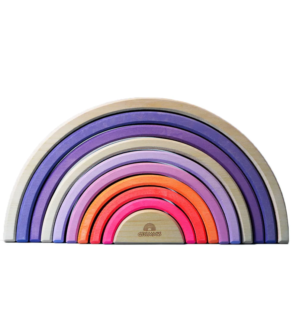 Skøn Grimms trælegetøj med form som en regnbue i rosa og lilla nuancer.