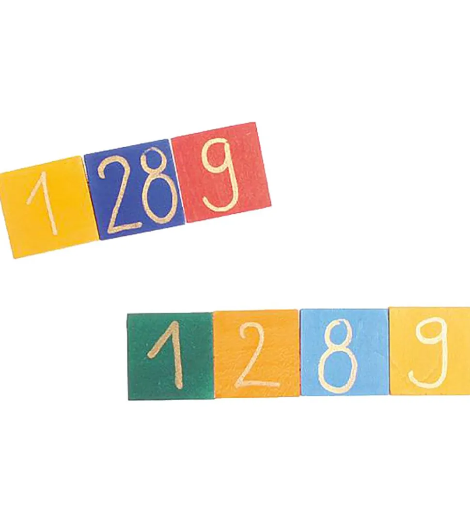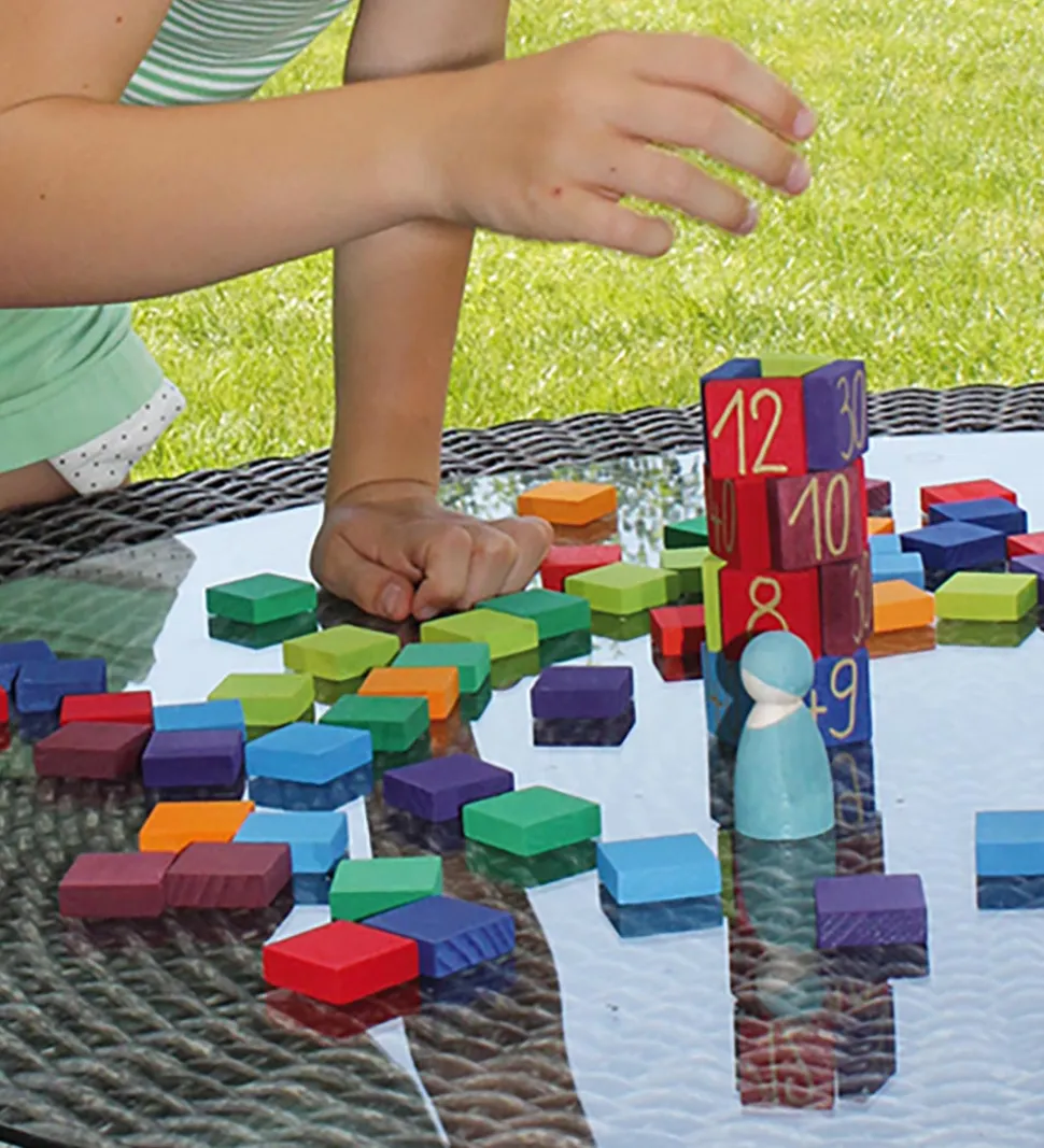 Lærerigt Grimms trælegetøj bestående af en bakke i naturlig træ og 200 brikker, med et farvekodet design, så man lærer hvad de forskellige brikker har af motiv. Hver brik har et tal eller et matematisk symbol (plus, minus, gange, divider og lig med tegn).