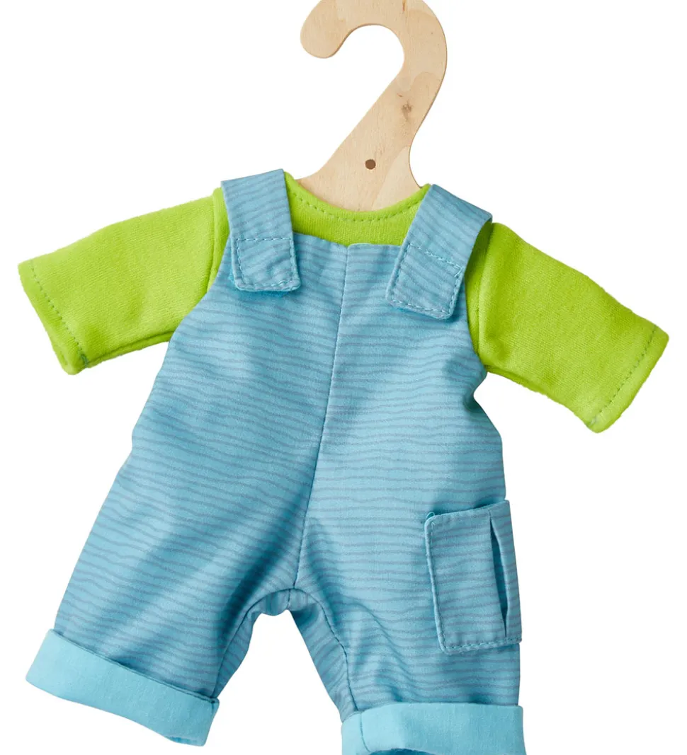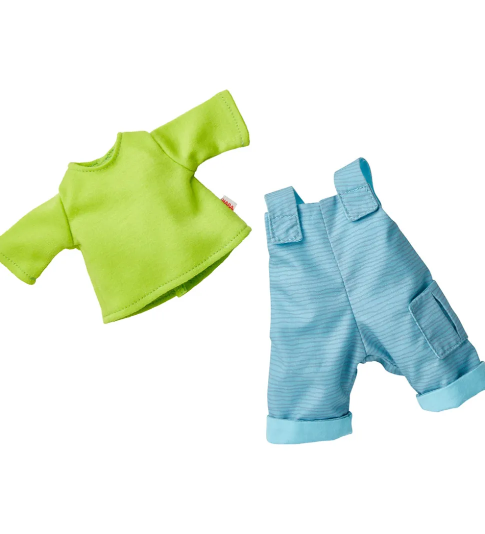 Charmerende HABA dukketøj bestående af et sæt med en grøn bluse og et par blå smækbukser. Blusen har korte ærmer, mens smækbukserne har fine små lommer og velcrostropper.