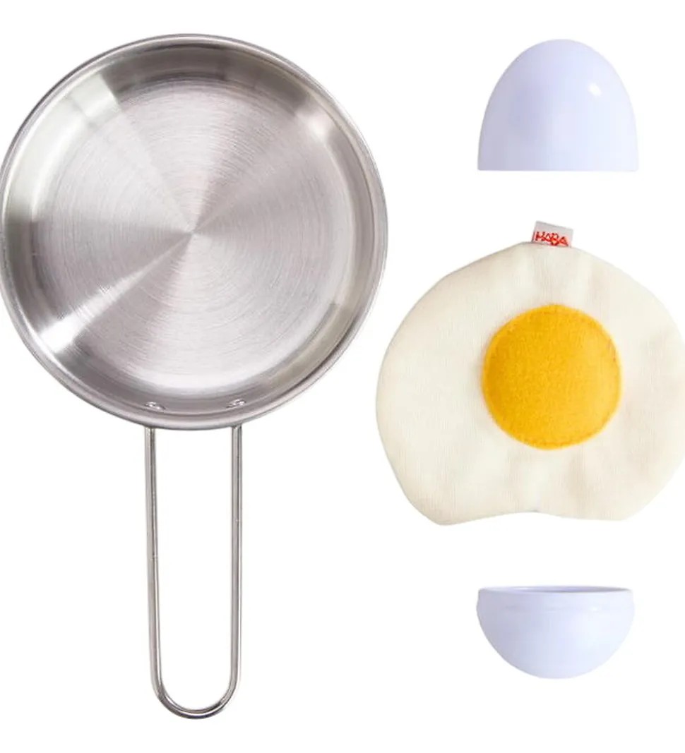 Herlig HABA legemad bestående af en sølvfarvet pande, hvidt æg med gul blomme og to hvide æggeskaller. HABA legemad inspirerer til fantasifuld leg og madlavning i børnehøjde.