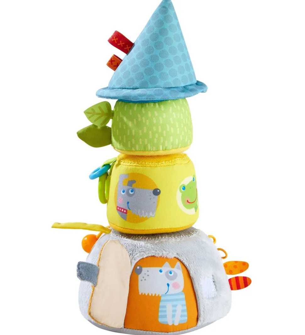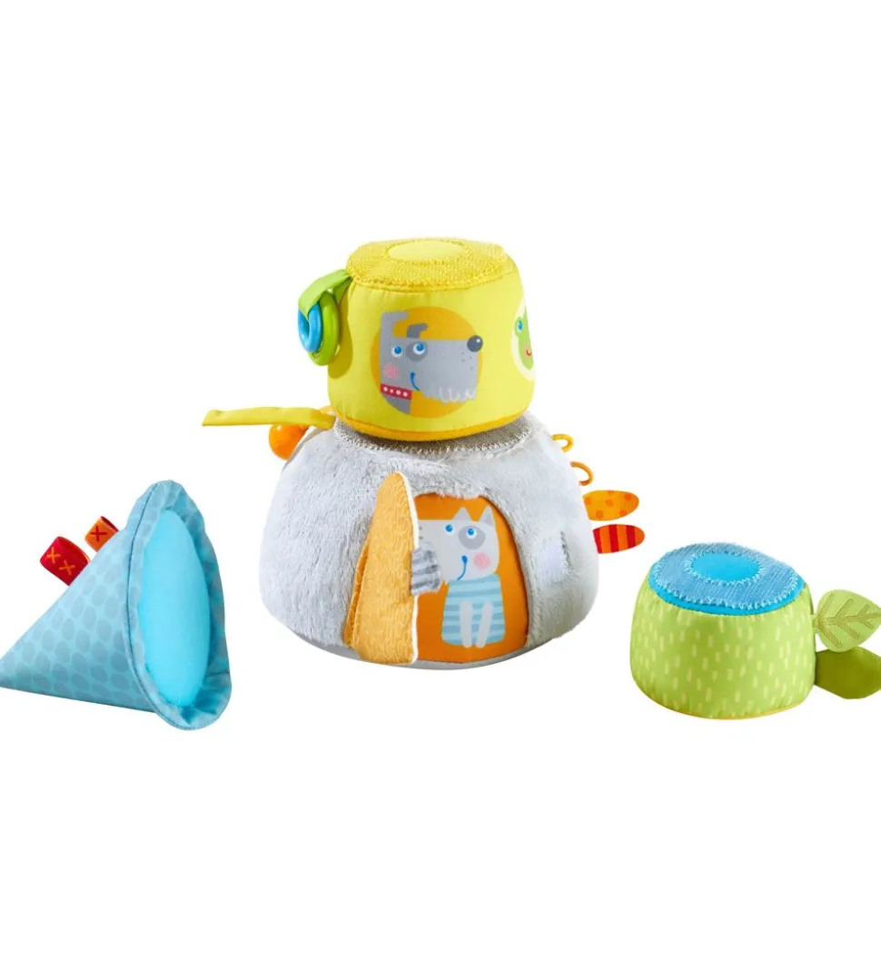 Sjovt Haba stabelegetøj med fire dele i forskellige størrelser og farver, der nemt kan stables ved hjælp af velcro. Stablelegetøjet har motiver af søde dyrefigurer i form af en kat, en hund og en frø.