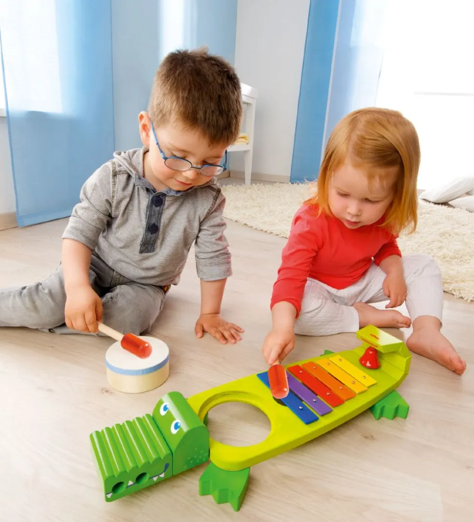 Haba Xylofonen er af træ og har seks metalbarer i gul, lysebrun, orange, rød, lilla og mørkeblå og kan spilles på med to grebsvenlige trækøller. På krokodillens hale er en sjov klokke, der ringer når halen foldes tilbage. Bag ved krokodillens hoved er en tromme, der kan tages ud og spilles på seperat. Instrumentet giver dit barn en sjov mulighed, for at udforske musikkens verdens og stimulere fantasi og koordination.