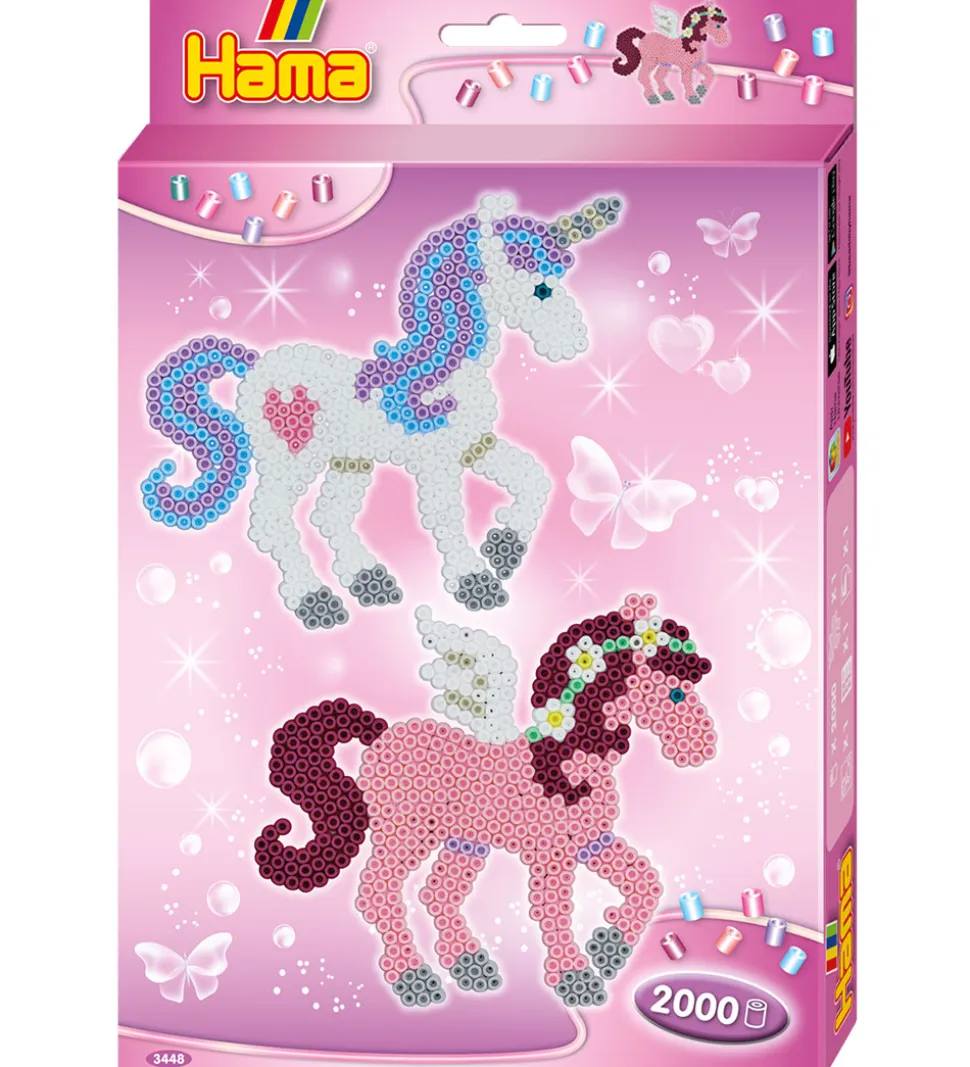 Hama perlesættet kommer i en fin papkasse, og indeholder: