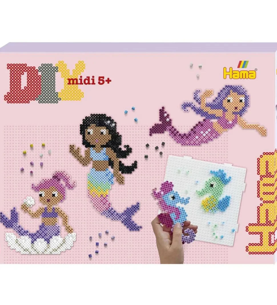 Sød Hama perlesæt med et havfruetema med fire mulige designs.