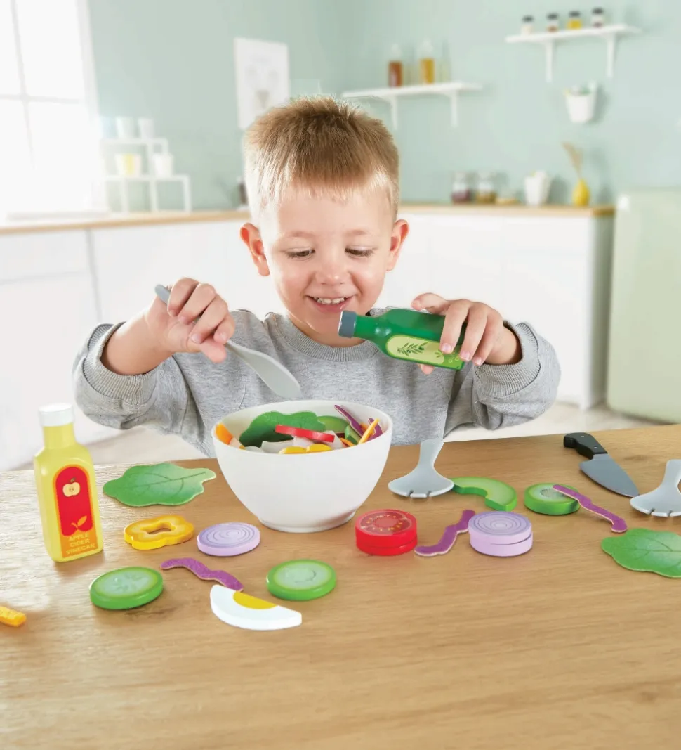 Hape legemaden er fremstillet i træ og bløde materialer, som giver en behagelig oplevelse for barnet. Sættet indeholder alt det nødvendige til at lave en lækker salat, med medfølgende skål, kniv og skeer samt meget mere.