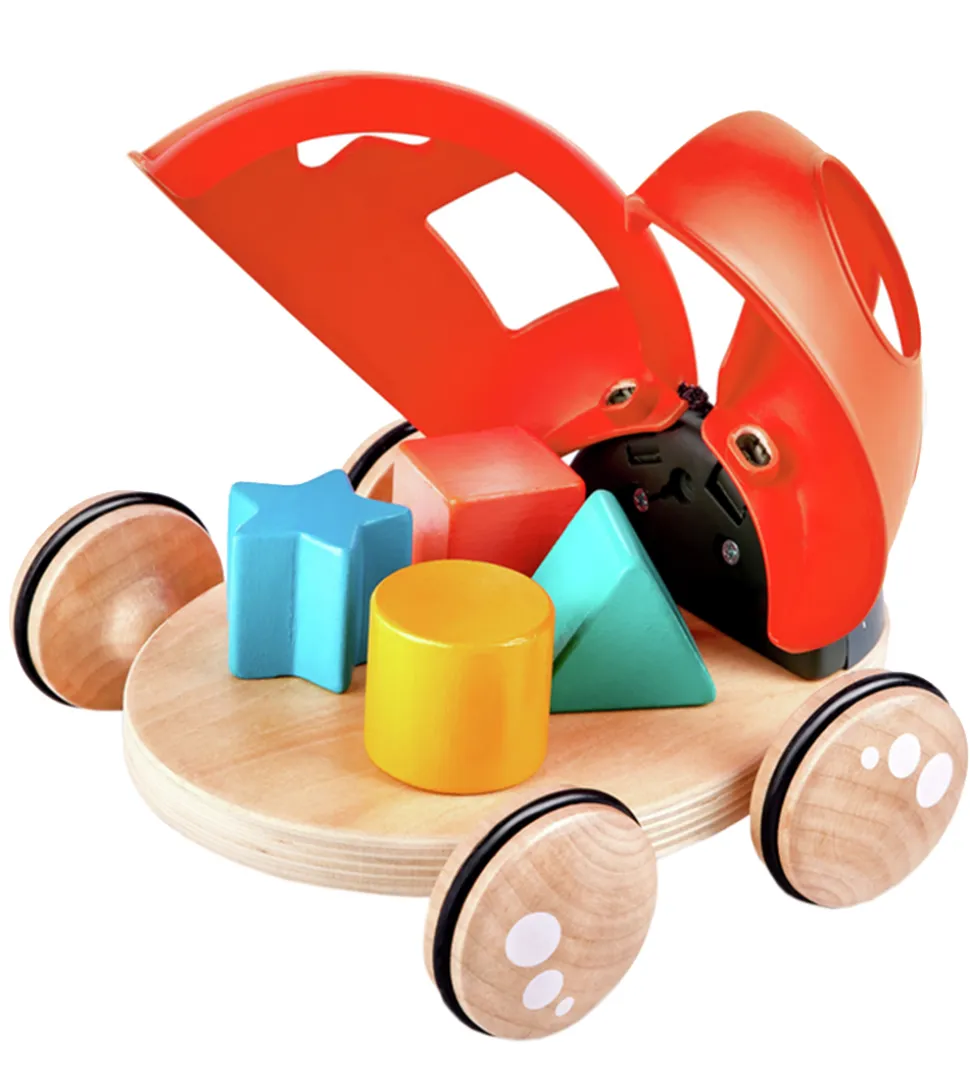 Hape trækdyret leveres med fire farverige klodser til leg, der stimulerer kreativitet og finmotorik.