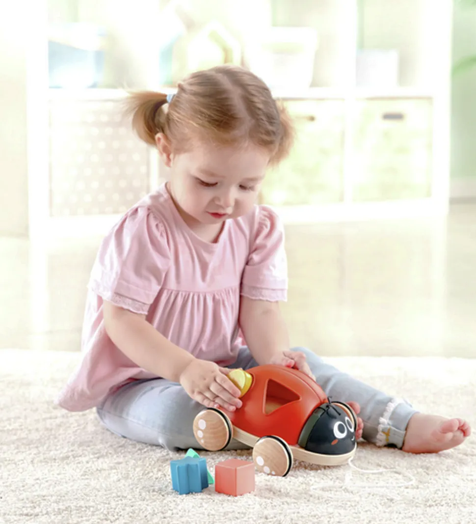 Farverigt Hape trækdyr i form af en mariehøne i rød med søde øjne.
