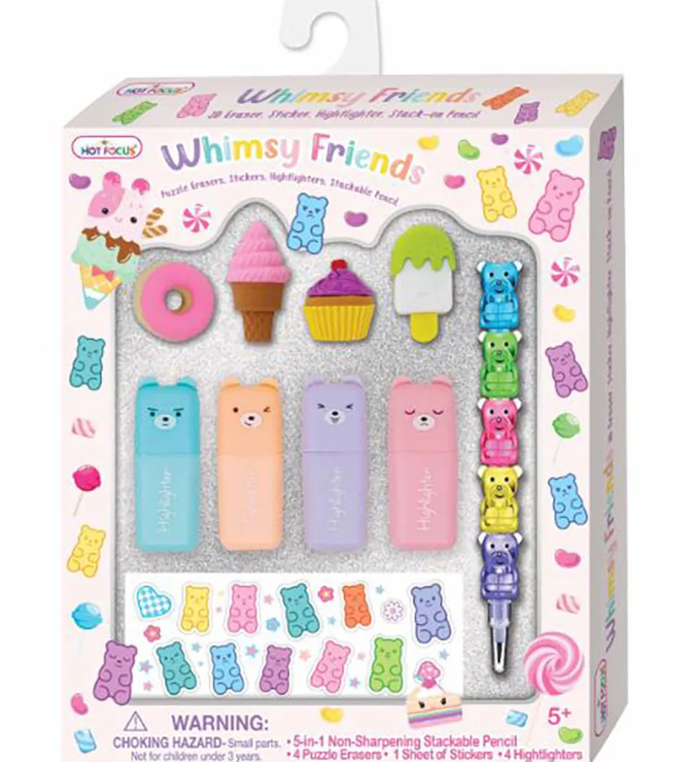 Farverigt Hot Focus sæt der inkluderer en blyant, highlightere, viskelædere og klistermærker, perfekt til kreative stunder og sjov i skolen.