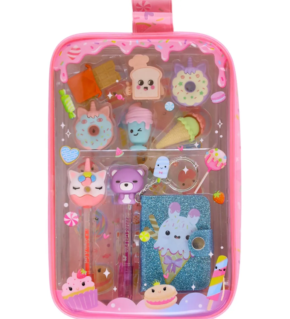 Charmerende Hot Focus taske med forskelligt tilbehør, der inkluderer seks viskelædere formet som søde sager, en nøglering med notesblok, to gelpenne og et ark klistermærker. Alt er perfekt organiseret i en praktisk, gennemsigtig taske.