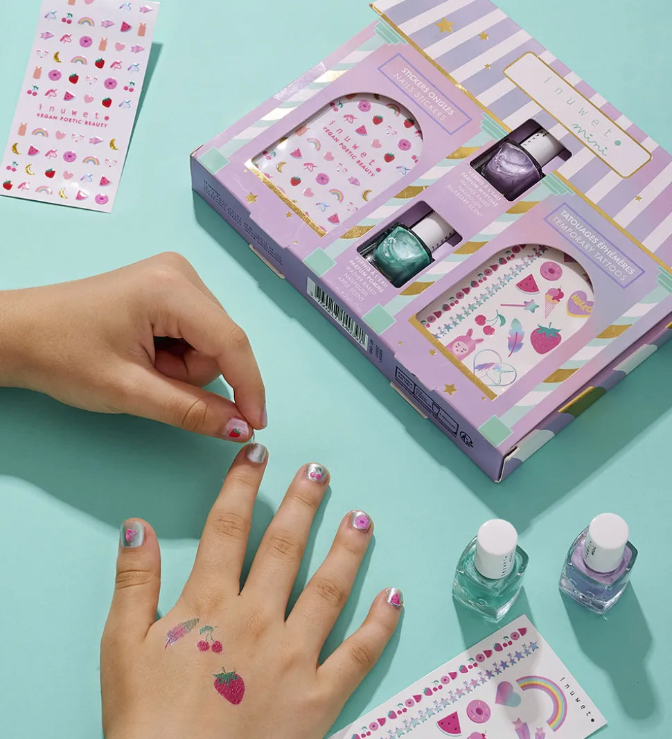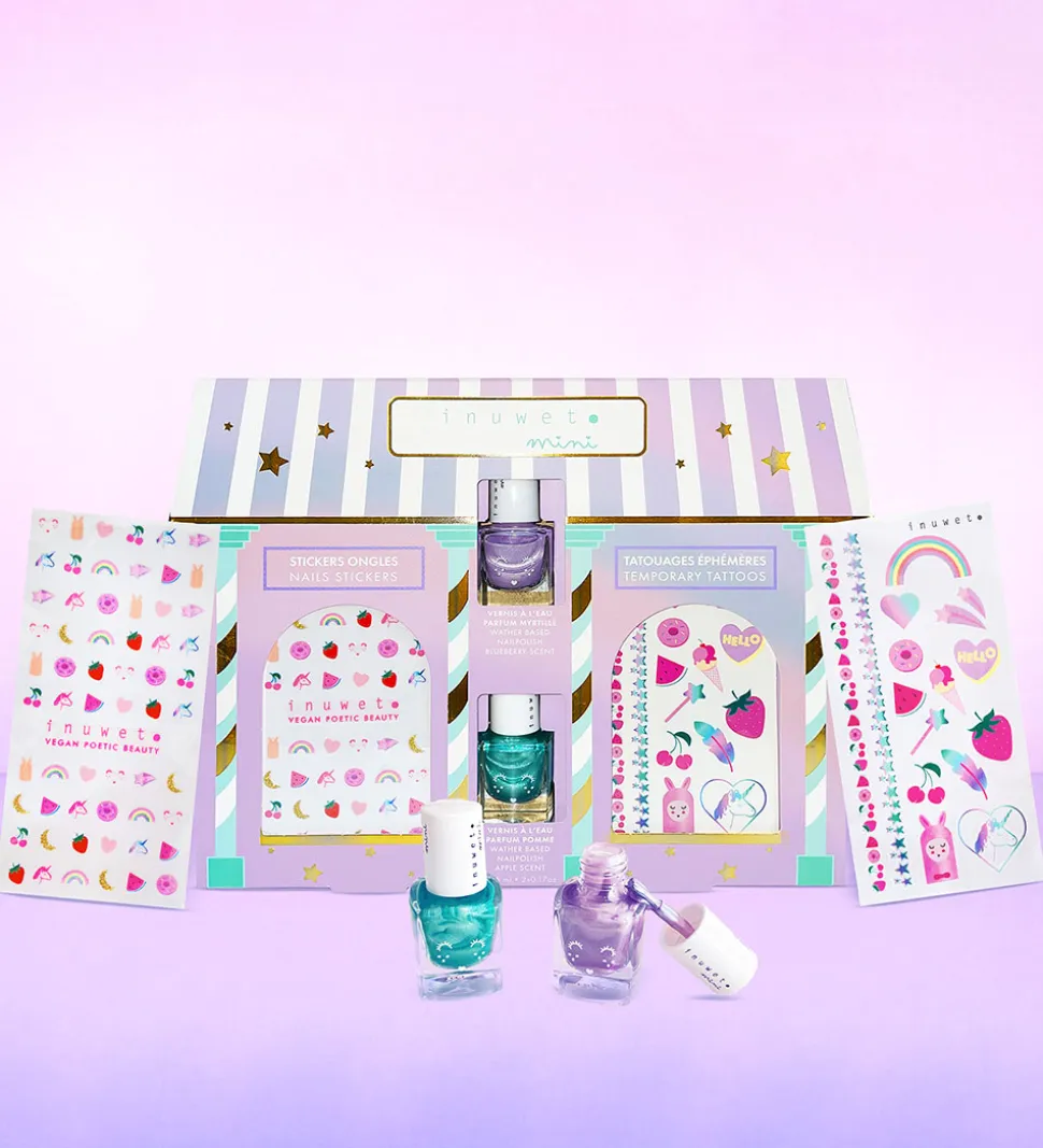 Skønt Inuwet gavesæt, som består af to neglelakker i metallisk lilla og turkis samt negleklistermærker og tatoveringer.