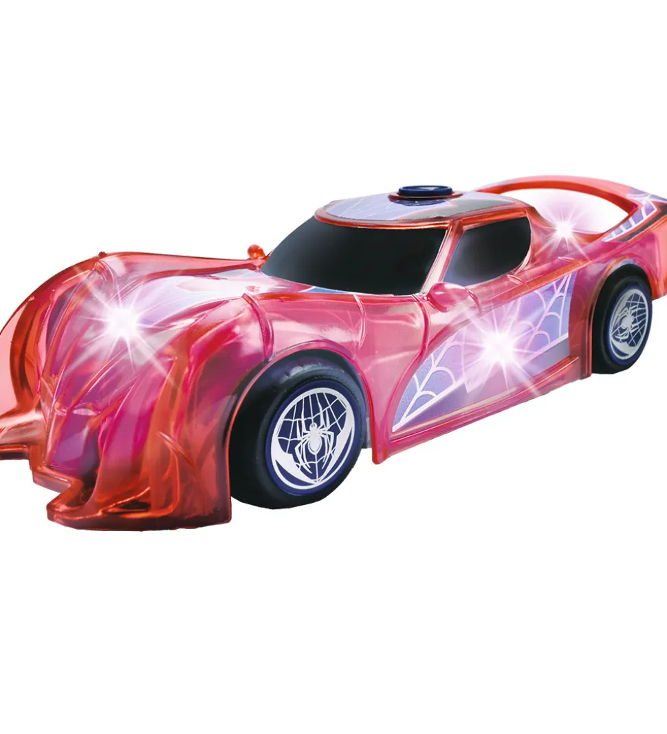 Sej Jada bil i rød med blå detaljer og print af en sort edderkop på toppen. Bilen er i modellen “Light Hero Spider-Man”.
