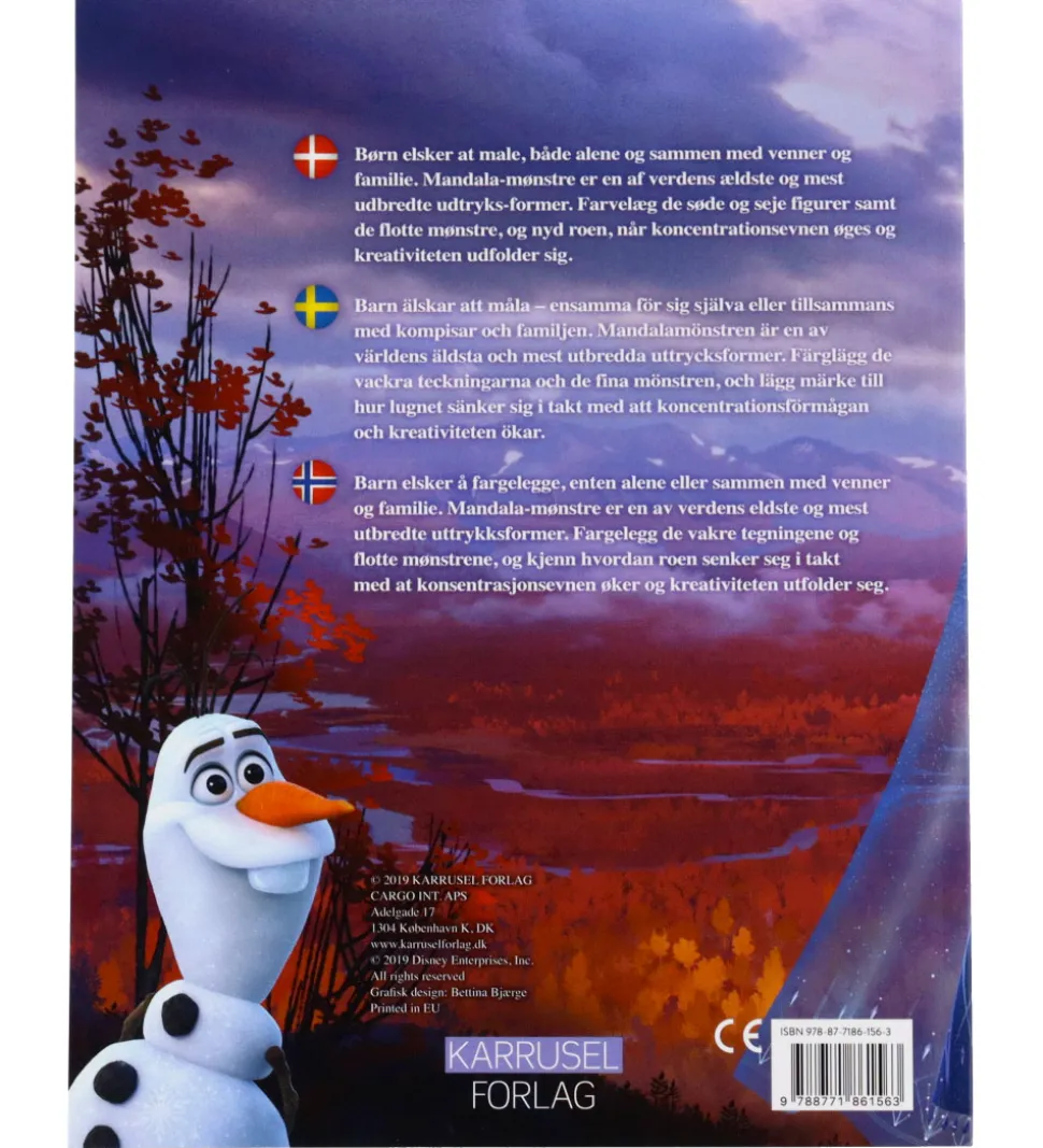 Yndig Karrusel Forlag malebog med Frost II med figurer som Elsa og Anna, som ender med at blive et farverigt kunstværk.