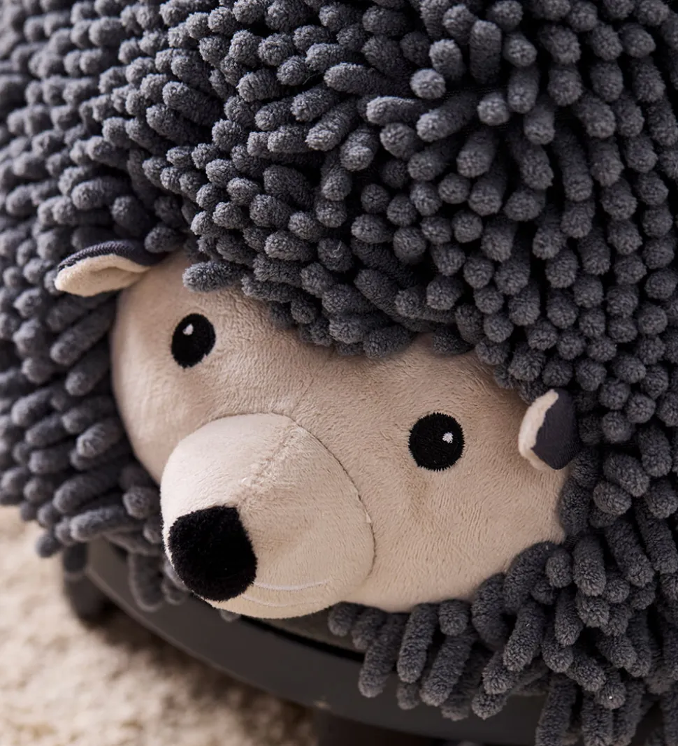 Sej Kids Concept ride on kart lavet som et nuttet pindsvin med nåle gråt, langlurvet stof og et sødt ansigt, der titter frem.