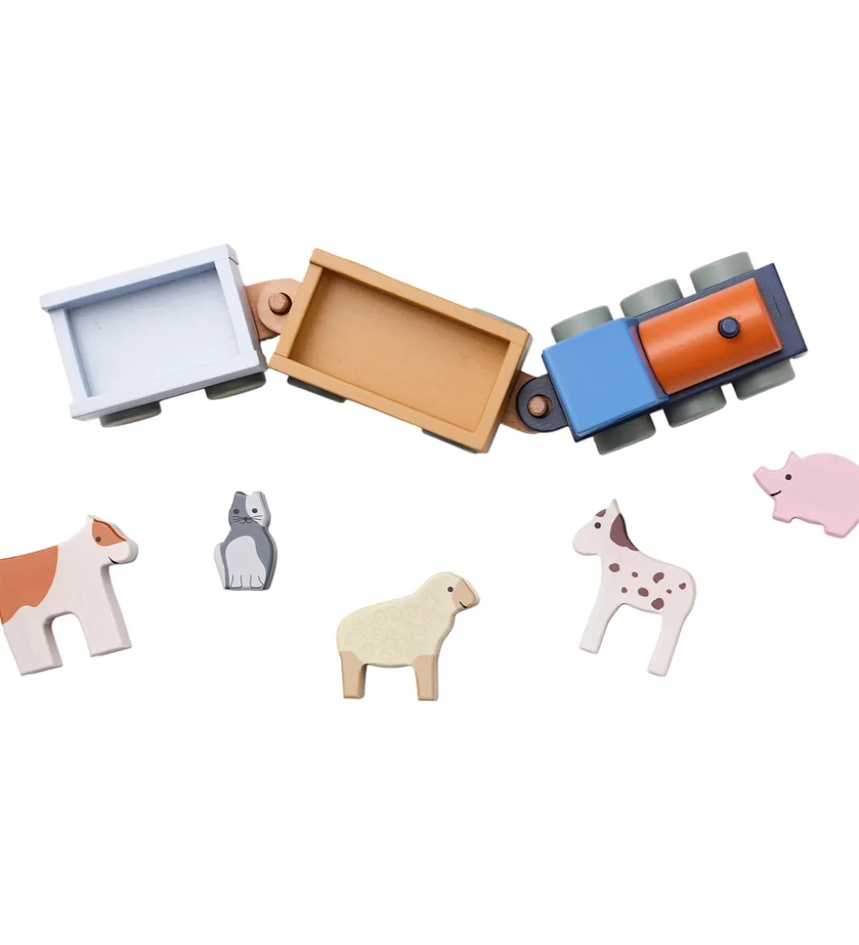 Kids Concept toget består af et lokomotiv med to vogne, og der medfølger 5 bondegårsdyr, som kan sættes fast på togvognene. Så er et bare med at køre ud i det blå på spændende eventyr med dyrene.