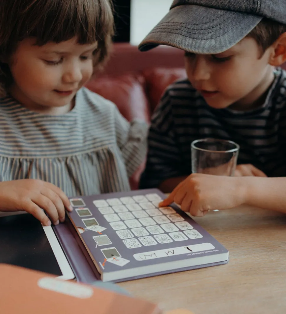 Underholdende Kidywolf LCD-tegnetavle med et blåt, beskyttende bogcover med rum-tema. Der medfølger 15 dobbeltsidede ark med motiver, der passer til temaet.