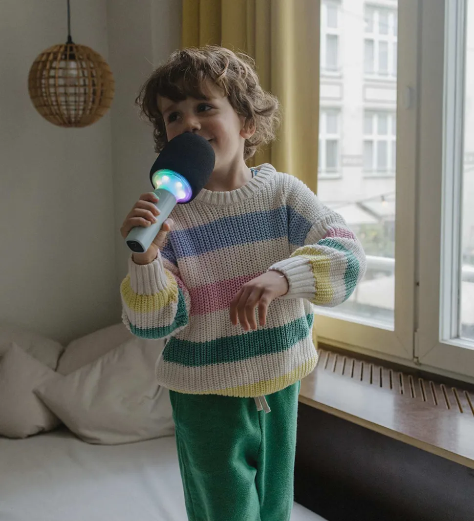 Sjov Kidywolf mikrofon i lysegrå og sort. Mikrofonen har indbygget LED-lys, som kan lyse op i forskellige farver. Mikrofonen kan fungere som almindelig mikrofon, men kan også indstilles så den ændrer stemmen. Den kan kobles til andre devices via bluetooth. Der medfølger et USB-C kabel, som kan oplade mikrofonen. Mikronen kan tændes, slukkes og indstilles på håndtaget.