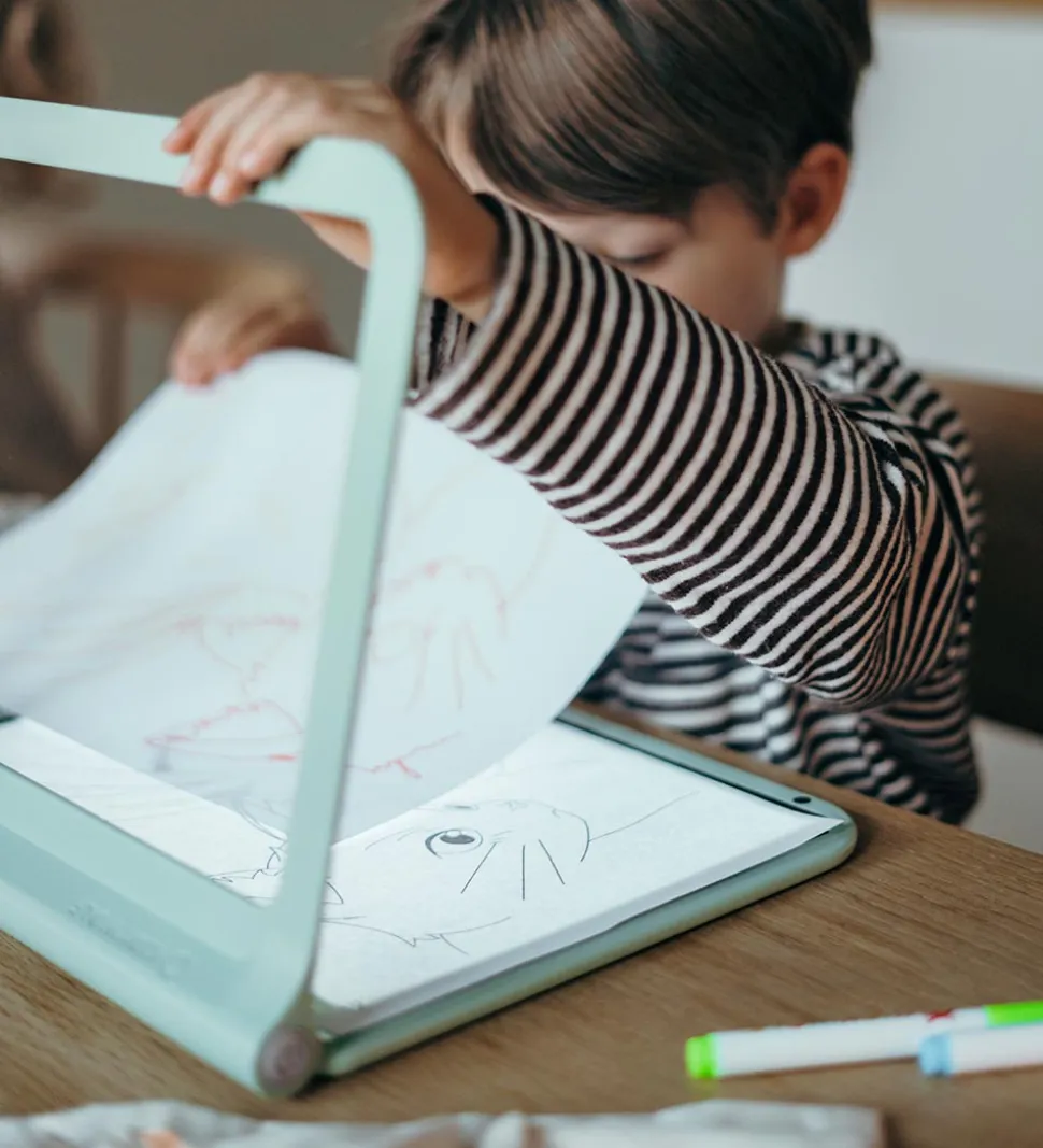 Sjov Kidywolf tegnetavle i et mintgrønt farvetema og med lys. Der medfølger fire tuscher (KUN til “Glow in the dark”-bagside), en blyant og 12 ark med billeder og bogstaver, barnet kan tegne efter. Tegnetavlen er lavet til A4-papir.
