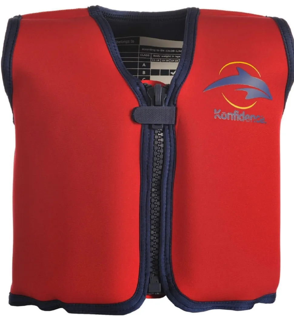 Lækker Konfidence svømmevest i rød med print af Konfidences velkendte delfinlogo på venstre bryst. Der står “The Original Konfidence Jacket” omme på ryggen, som er gul for at gøre svømmevesten synlig i vandet. Svømmevesten er fremstillet i blød og behagelig neopren, som er et fleksibelt materiale, der også er i våddragter. Neopren beskytter ligeledes mod solens UV-stråling, samtidig med den holder på barnets kropsvarme både i og ude af vandet.