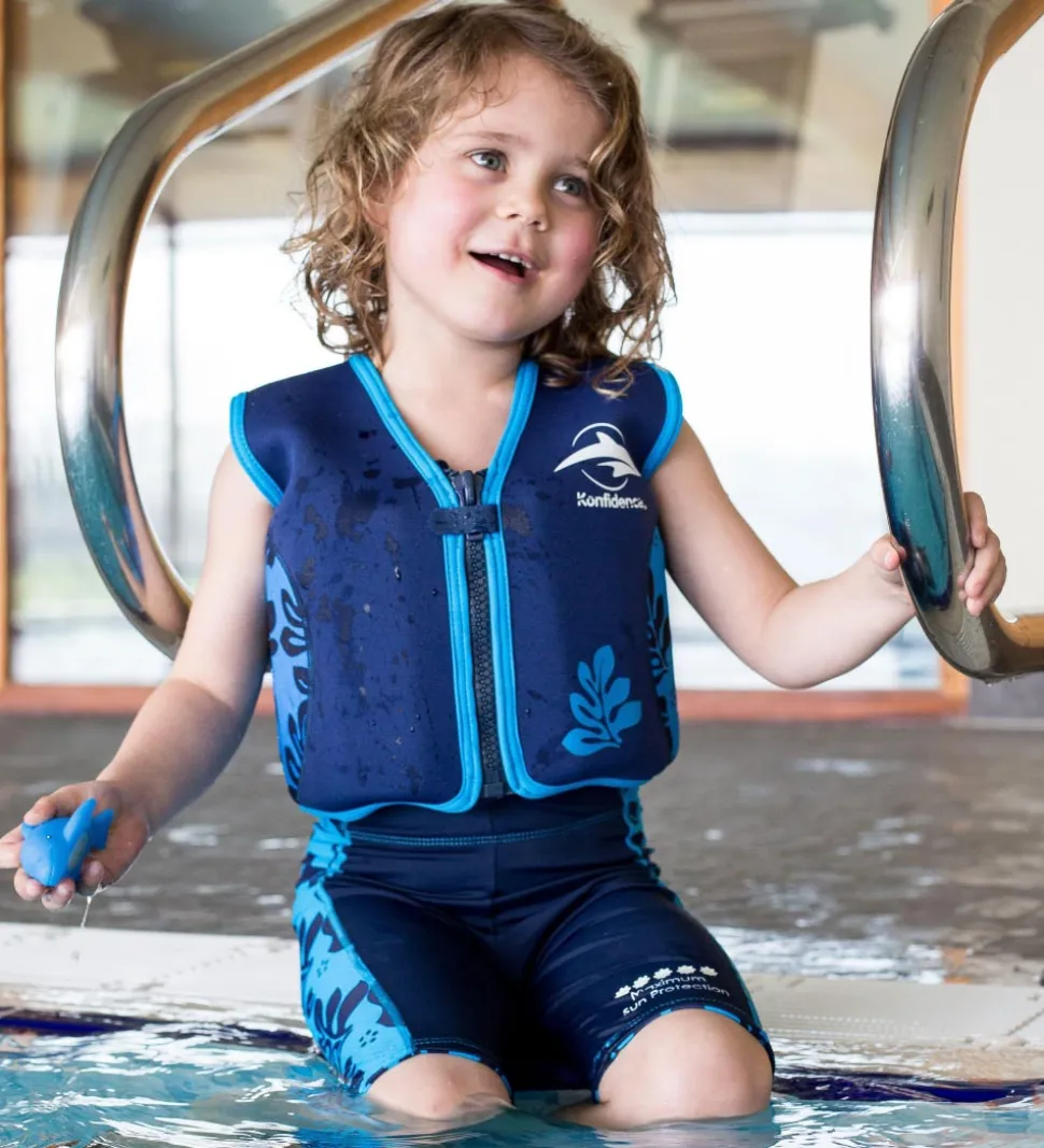 Lækker Konfidence svømmevest i blå og orange med print af klovnfisk i vand fortil. Bagtil er Konfidences velkendte delfinlogo øverst på ryggen, som er gul for at gøre svømmevesten synlig i vandet. Svømmevesten er fremstillet i blød og behagelig neopren, som er et fleksibelt materiale, der også er i våddragter. Neopren beskytter ligeledes mod solens UV-stråling, samtidig med den holder på barnets kropsvarme både i og ude af vandet.
