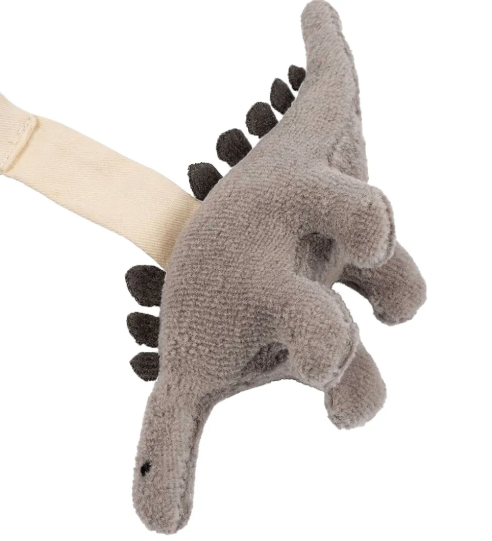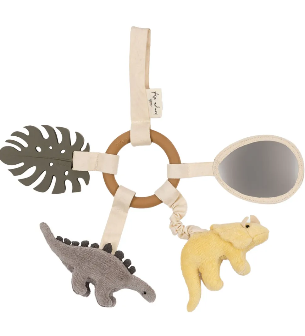 Sjov Konges Sløjd aktivitetsring med vedhæng i et dino-tema med afdæmpede farver.