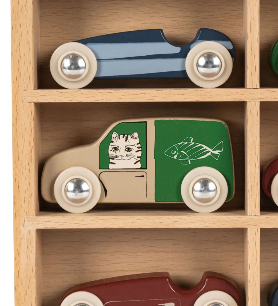 Hvert køretøj er dekoreret med unikke illustrationer, der tilføjer et sjovt og fantasifuldt element til legen. Perfekt til bilentusiaster. Bilsættet kommer med en træboks hvor bilerne kan opbevares.