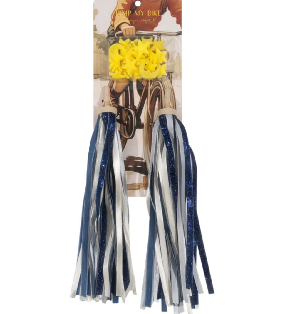 Farverigt og sjovt cykelpynt fra Konges Sløjd i form af streamers til styret i en flot kombination af blå, hvid og glitrende materialer samt stjerne- og måneformede perler til hjulene i gul.