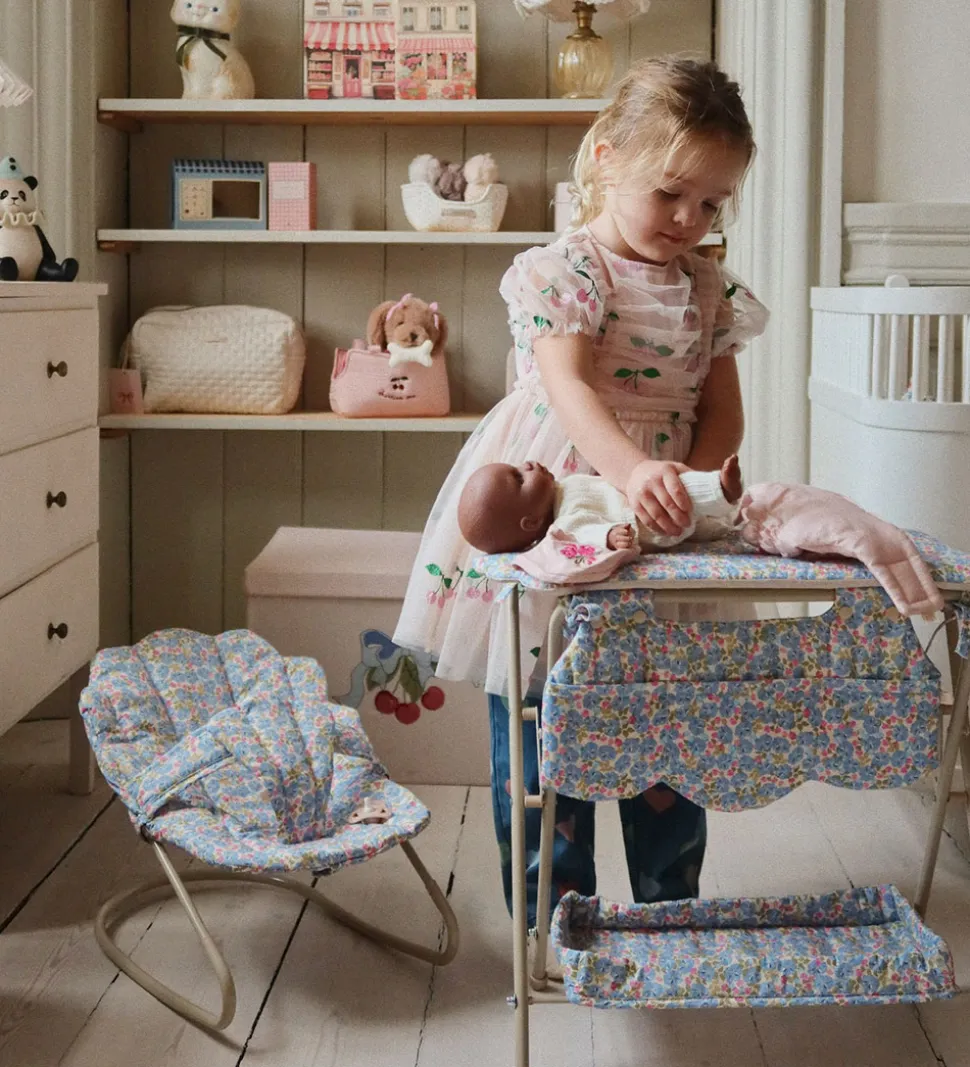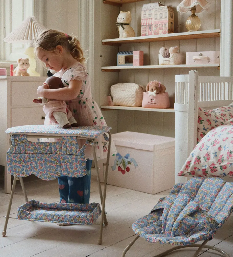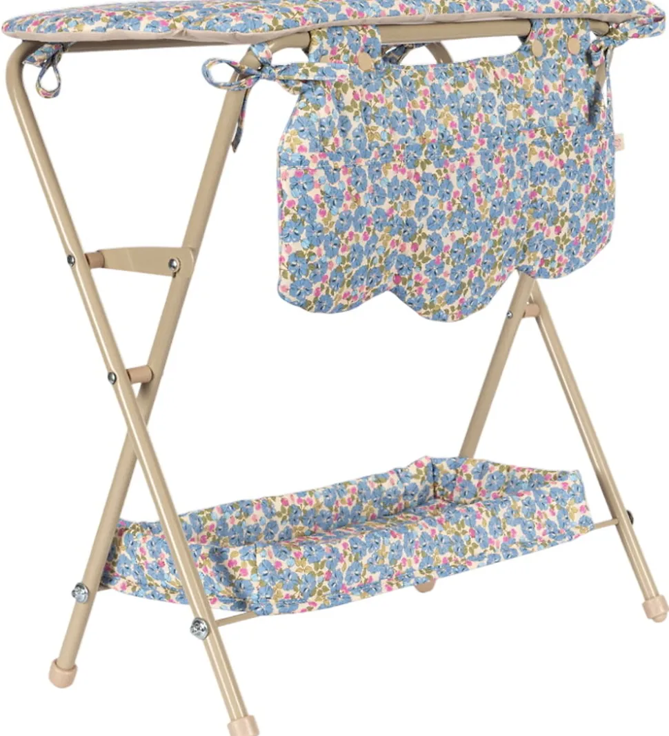 Fint Konges Sløjd puslebord til dukker med et farverigt blomsterprint og med en quiltet struktur og bølgede scallop-kanter.