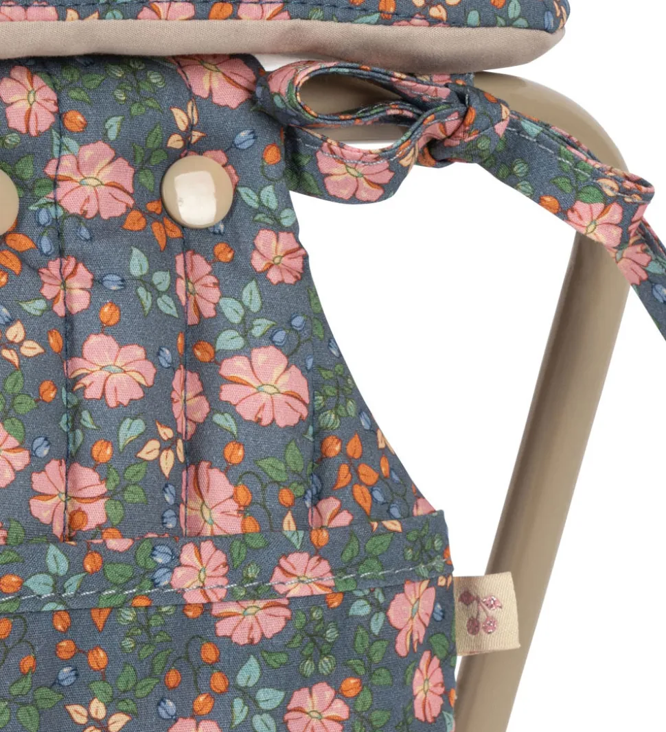 Flot Konges Sløjd puslebord til dukker i grøn med pink blomster og med en quiltet struktur samt bølgede scallop-kanter.