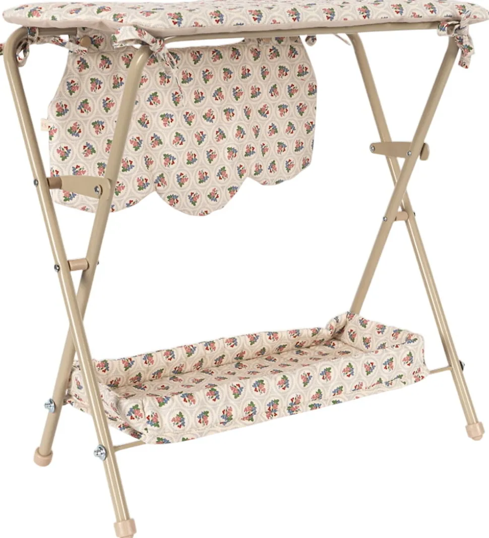 Flot Konges Sløjd puslebord til dukker i rosa med med et print med røde og blå blomster og med en quiltet struktur samt bølgede scallop-kanter.