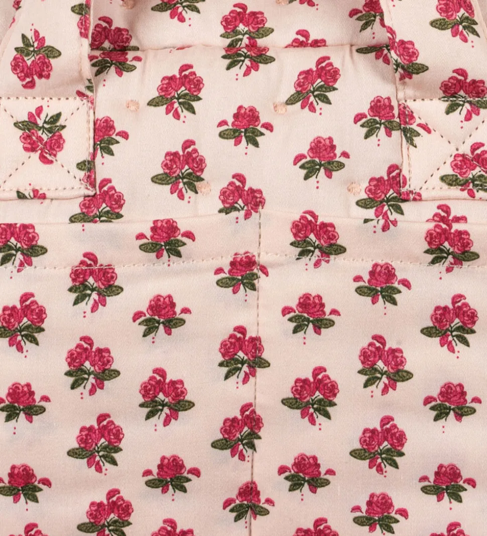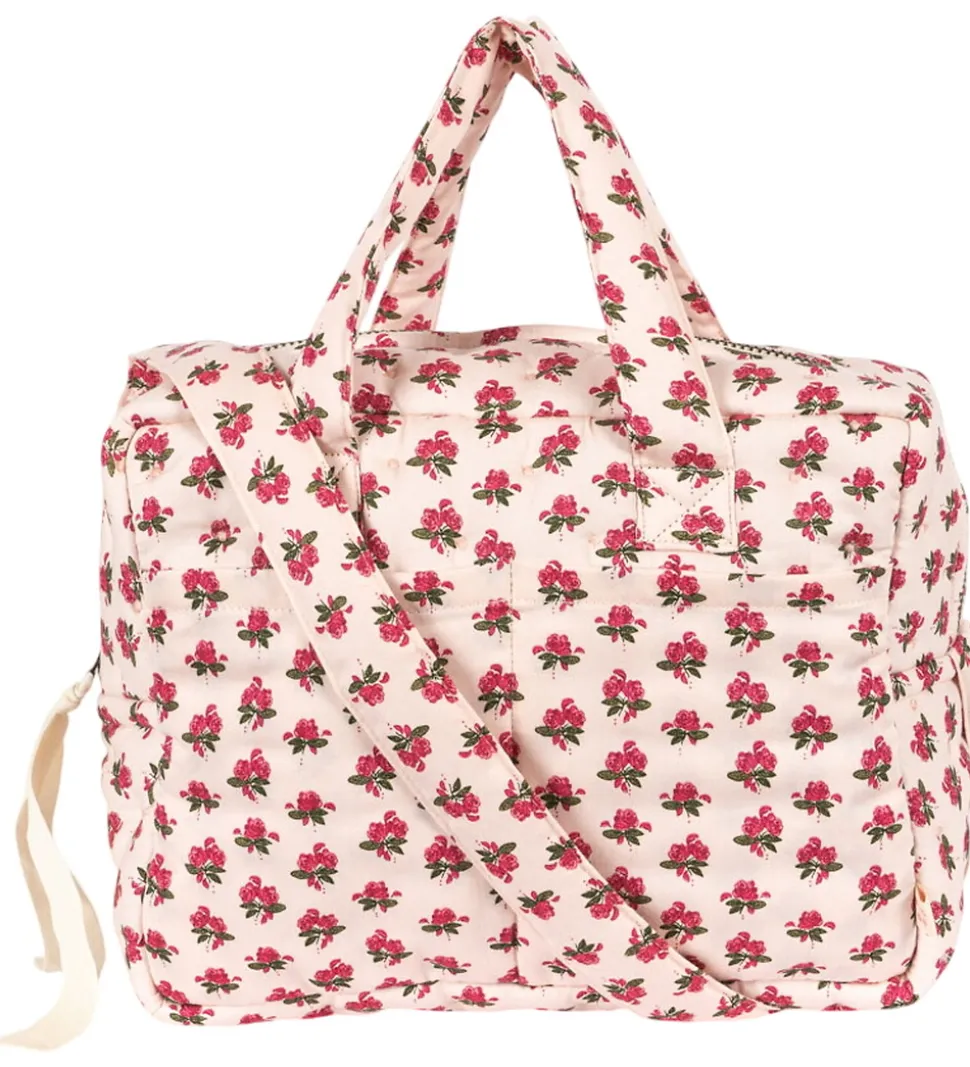 Skøn Konges Sløjd dukke pusletaske i en lys rosa med et rødt blomstermotiv.