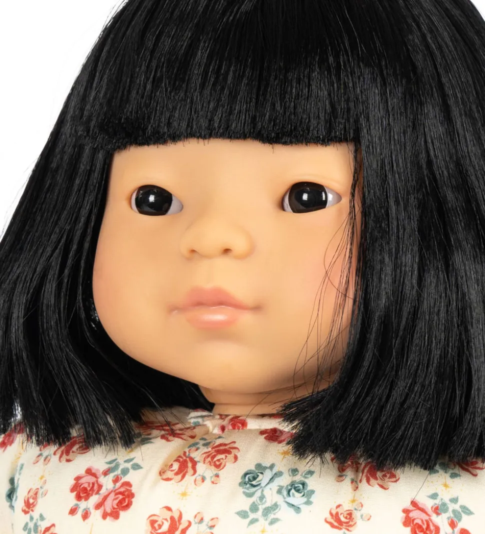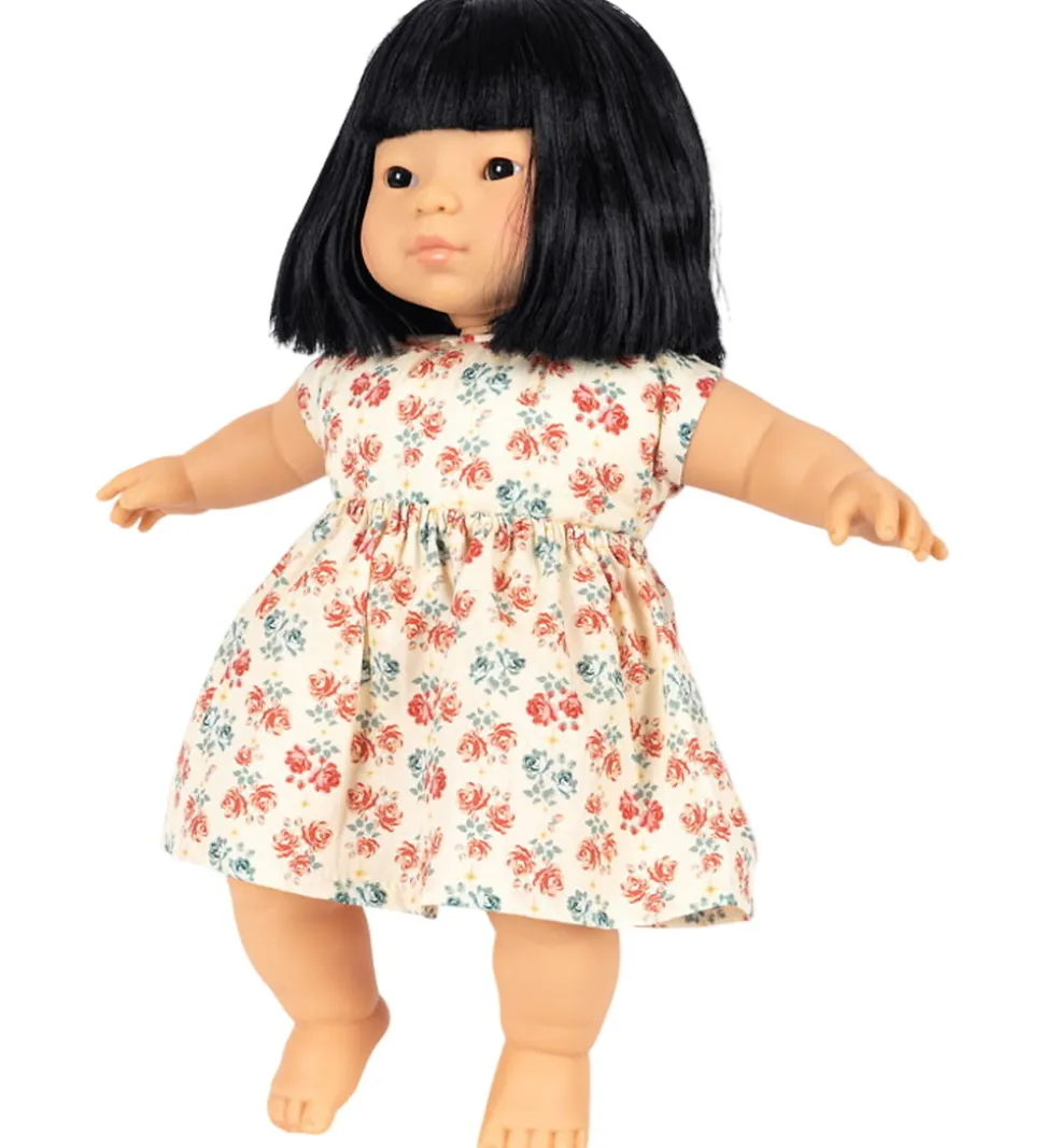Fin Konges Sløjd dukke i form af babyen Suki iført en sød, gul kjole med et blomsterprint i grønne og rosa nuancer. Dukken har blå øjne med dybde, så de ser ægte ud.