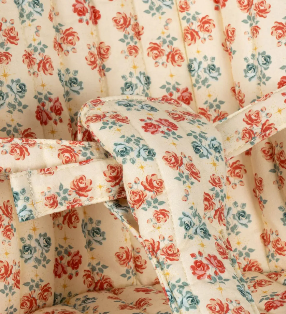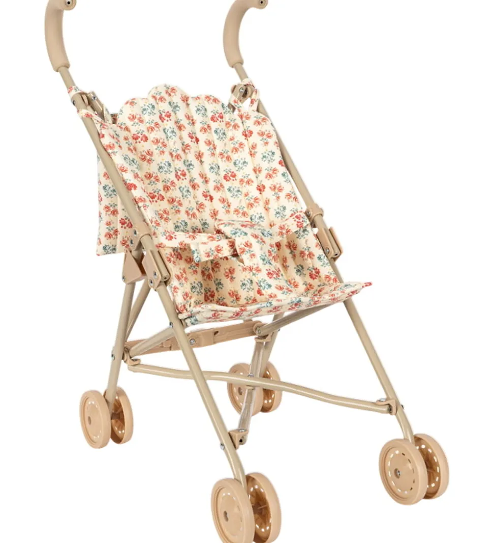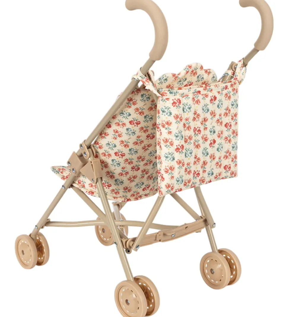 Skøn Konges Sløjd dukkeklapvogn i rosa med et print med røde og blå blomster.