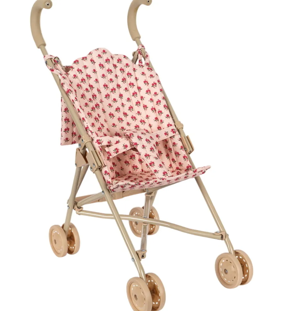 Smart Konges Sløjd dukkeklapvogn i lyserosa med et flot blomsterprint i røde nuancer.