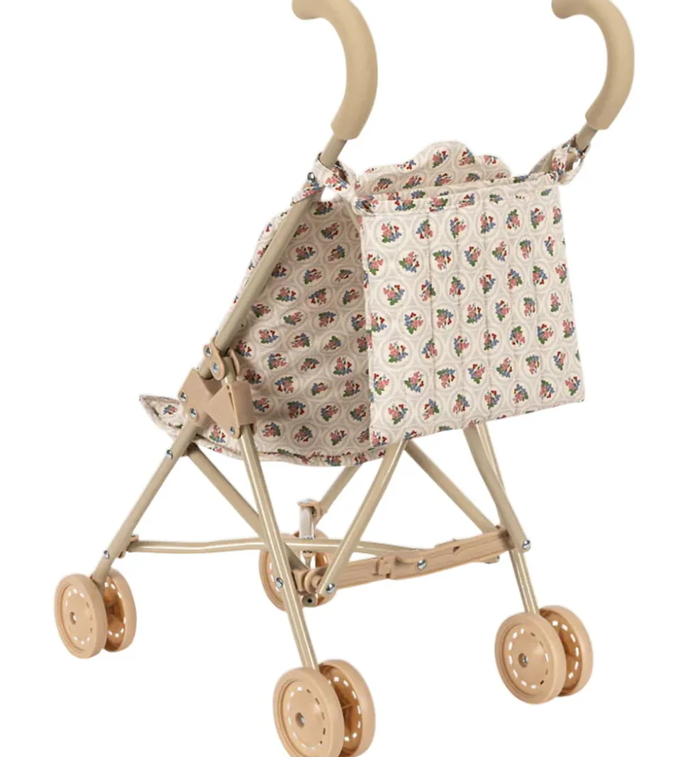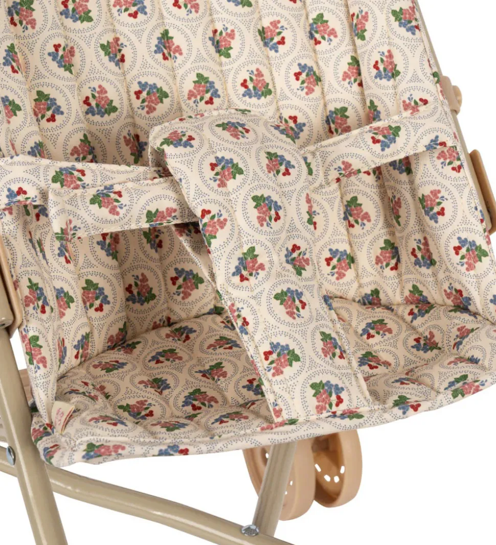 Lækker Konges Sløjd dukkeklapvogn i beige med et print med røde og blå blomster.