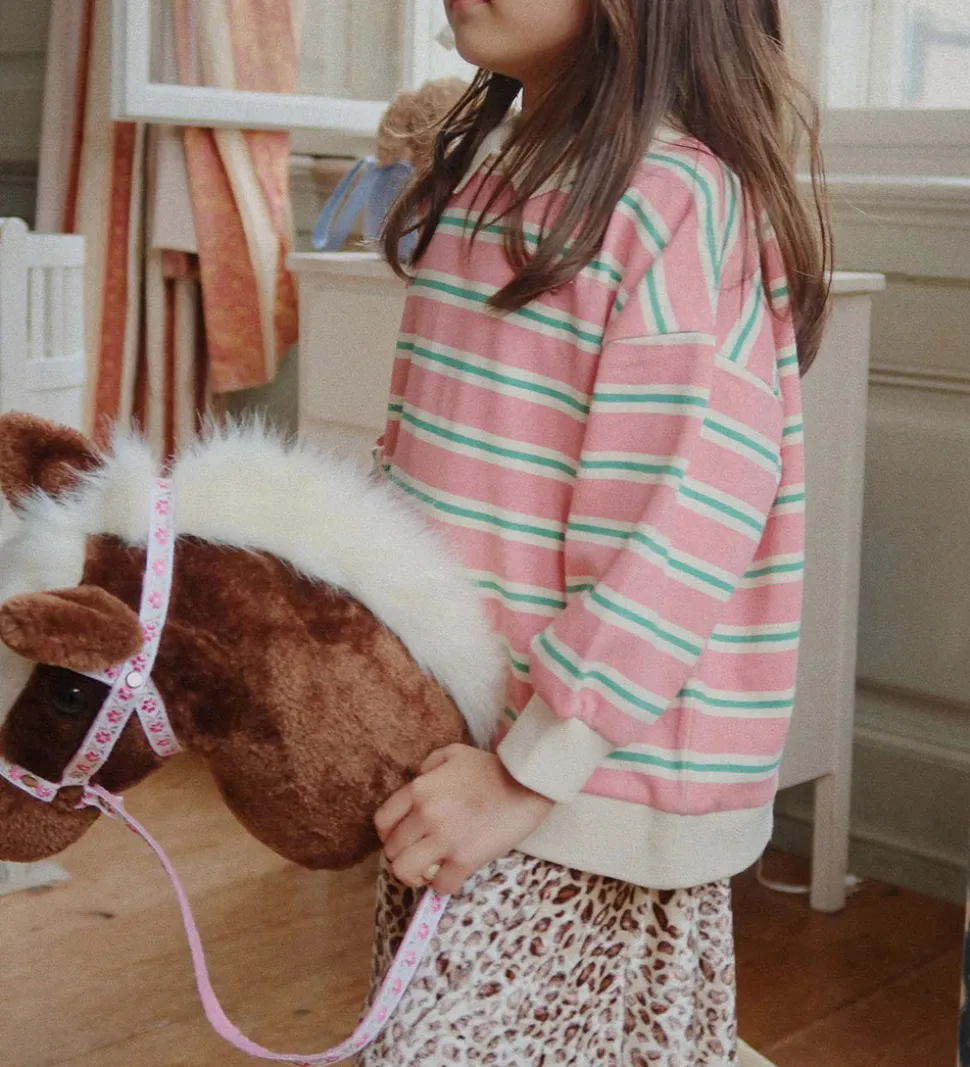 Flot Konges Sløjd kæphest i brun med en hvid manke og hvidt seletøj med rosa blomster.