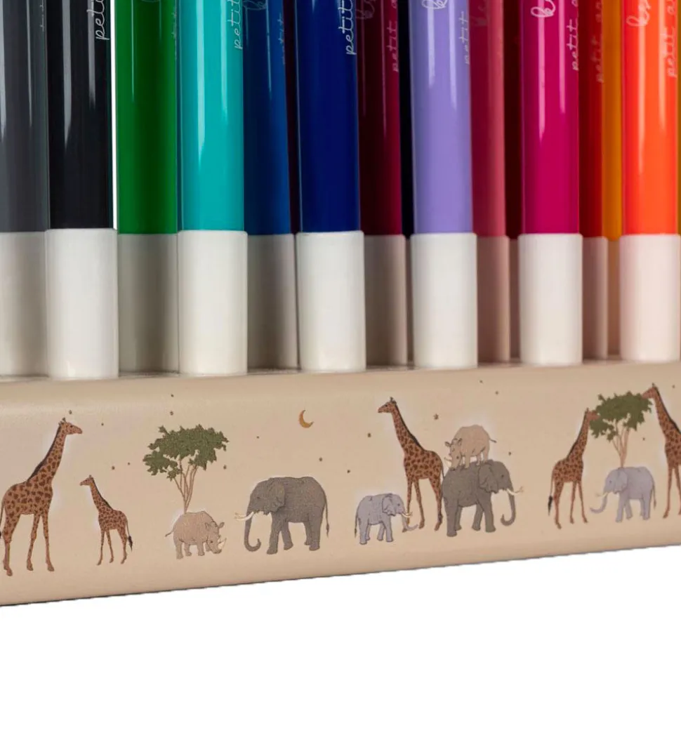 Fine Konges Sløjd tuscher i en træklods med print af søde safaridyr.