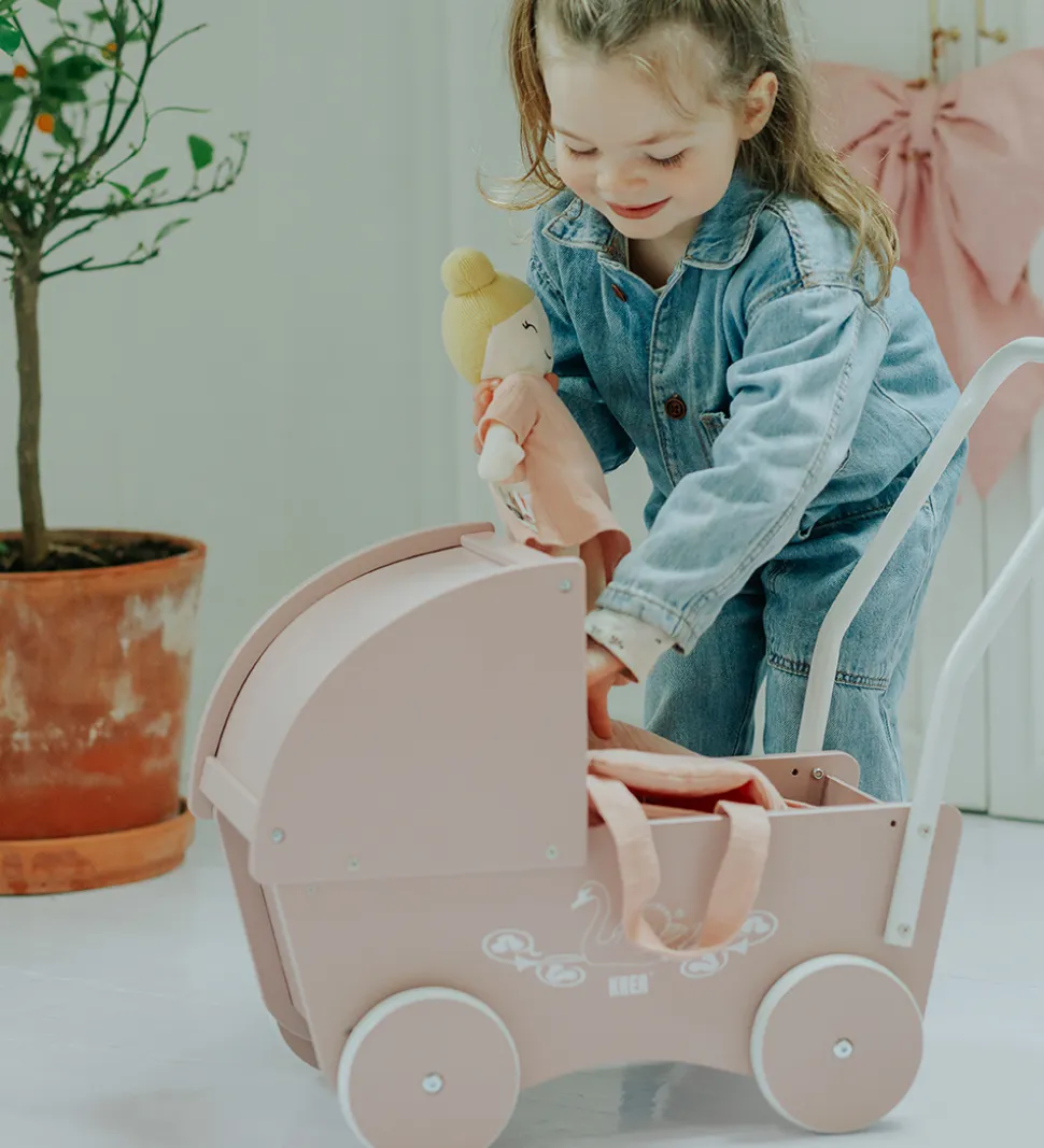 Dukkevognen udvikler barnets motoriske færdigheder, fantasi og rolleleg.