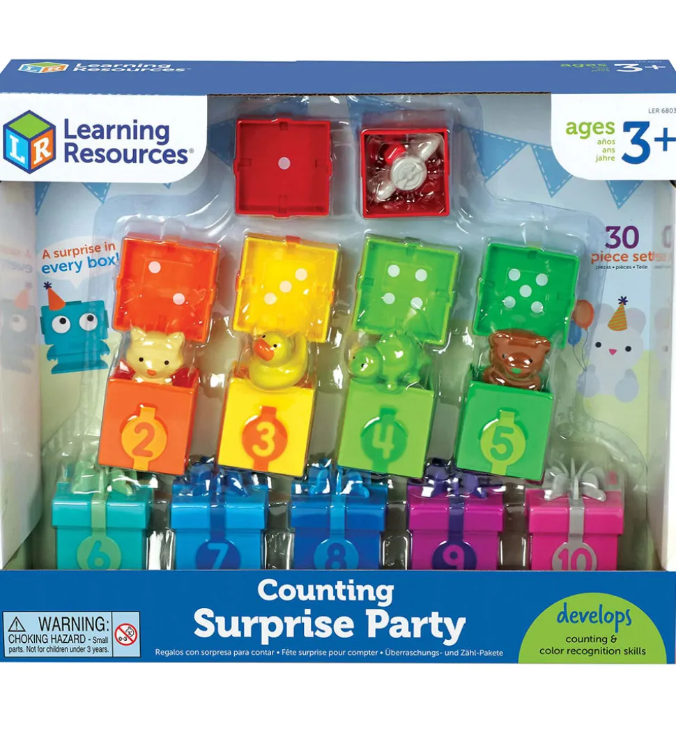 Aktivitetslegetøjet indeholder små gaver i forskellige farver og med forskellige tal på. Indeni hver gave gemmer sig en lille figur. Barnet kan sætte låget på gaveæsken i samme farve og med samme tal, og åbne op for den lille overraskelse indeni igen og igen. Aktivitetslegetøjet styrker finmotorikken samtidig med at man kan øve farver og tal.