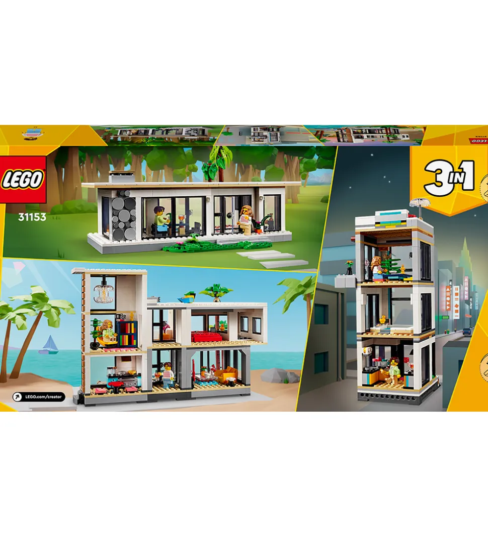 Spændende LEGO® Creator sæt med i alt 939 klodser, som kan samles til hele tre forskellige ting: et moderne hus på stranden, et stilfuldt 3-etagers byhus med tagterrasse og en skovhytte.