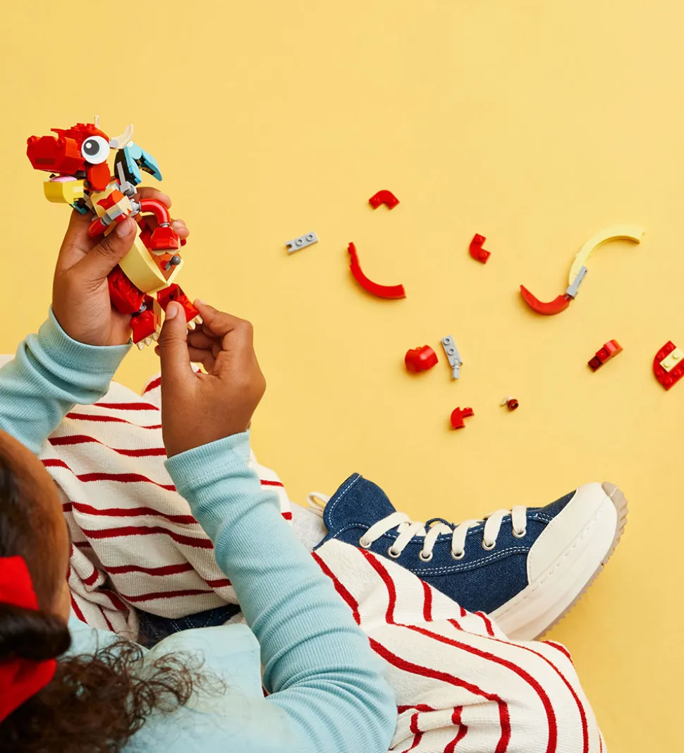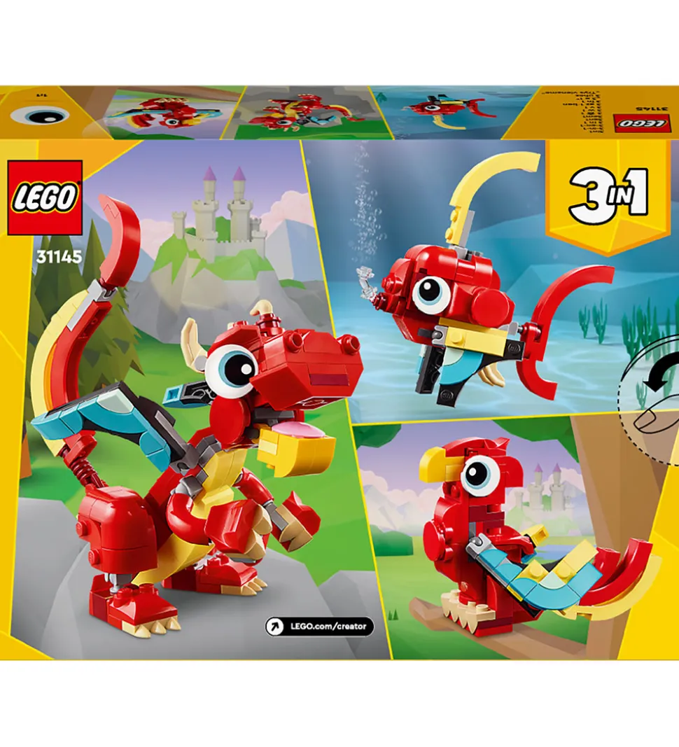 Spændende LEGO® Creator sæt med i alt 149 klodser, som kan samles til hele tre forskellige ting: en rød drage, en rød føniks og en rød fisk. Alle tre dyr har bevægelige led.