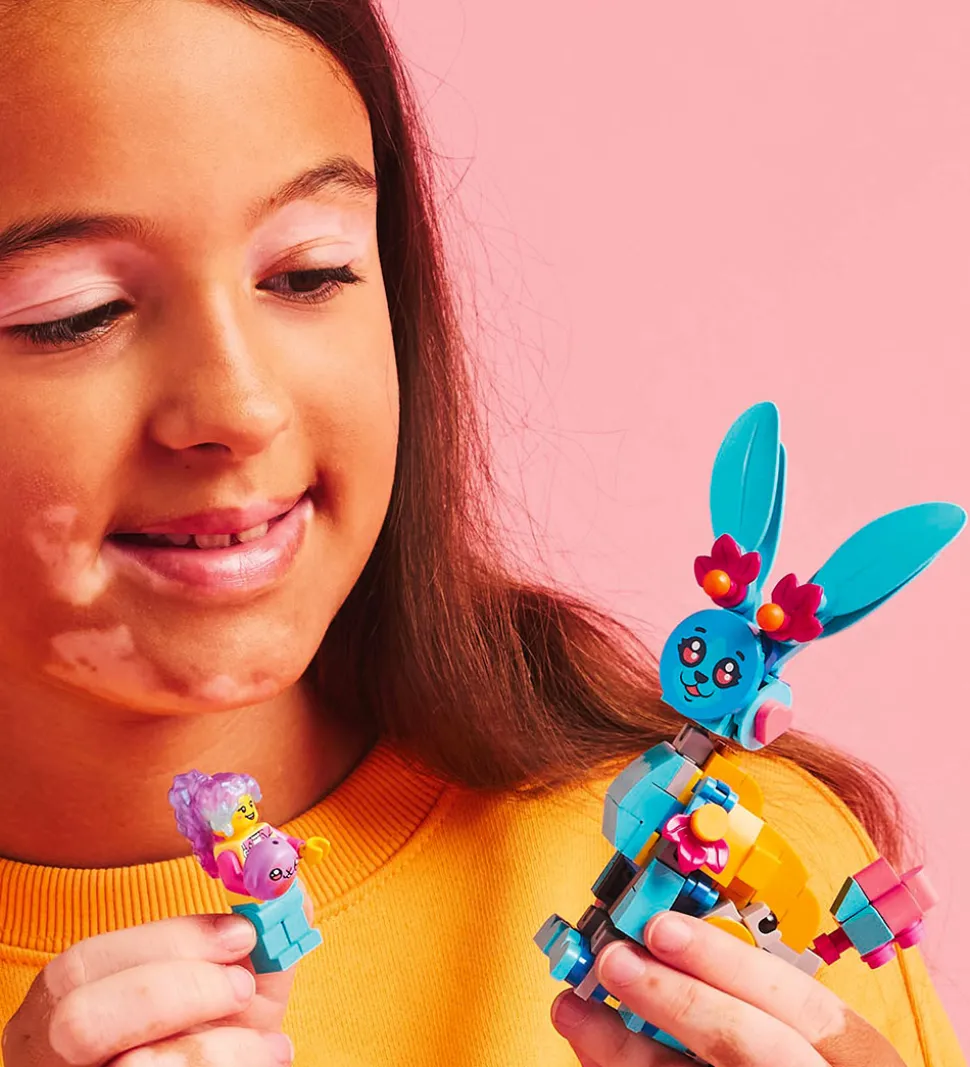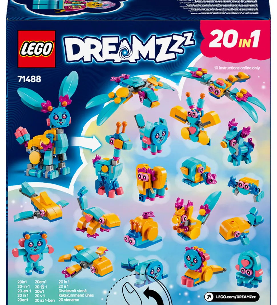 Sejt LEGO® DREAMZzz sæt med i alt 143 klodser, der kan samles til sættet “Bunchus kreative dyreeventyr” med 20 forskellige byggemuligheder såsom en Bunchu-kaninfigur, en elefant, en snegl, en haj, en krabbe, en fugl, en fugleunge, en hval, en skildpadde, en giraf, en kat, en bamse, et egern, en løve, en sommerfugl, en hjort, en kamæleon, en guldsmed, en sæl og en blæksprutte.