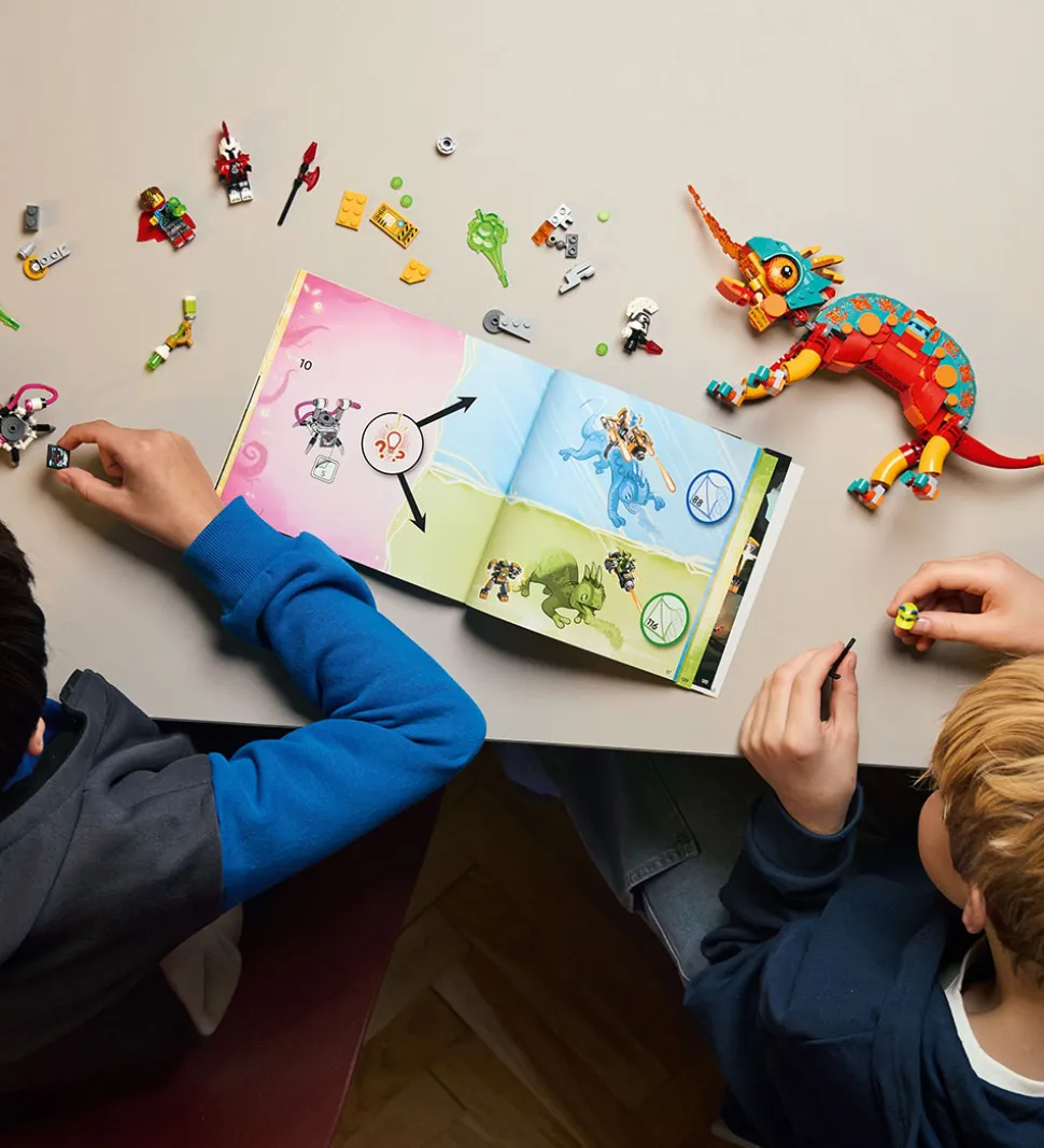 Sejt LEGO® DREAMZzz sæt med i alt 443 klodser, der kan samles til Mateos ildkamæleon med to ombygningsmuligheder.